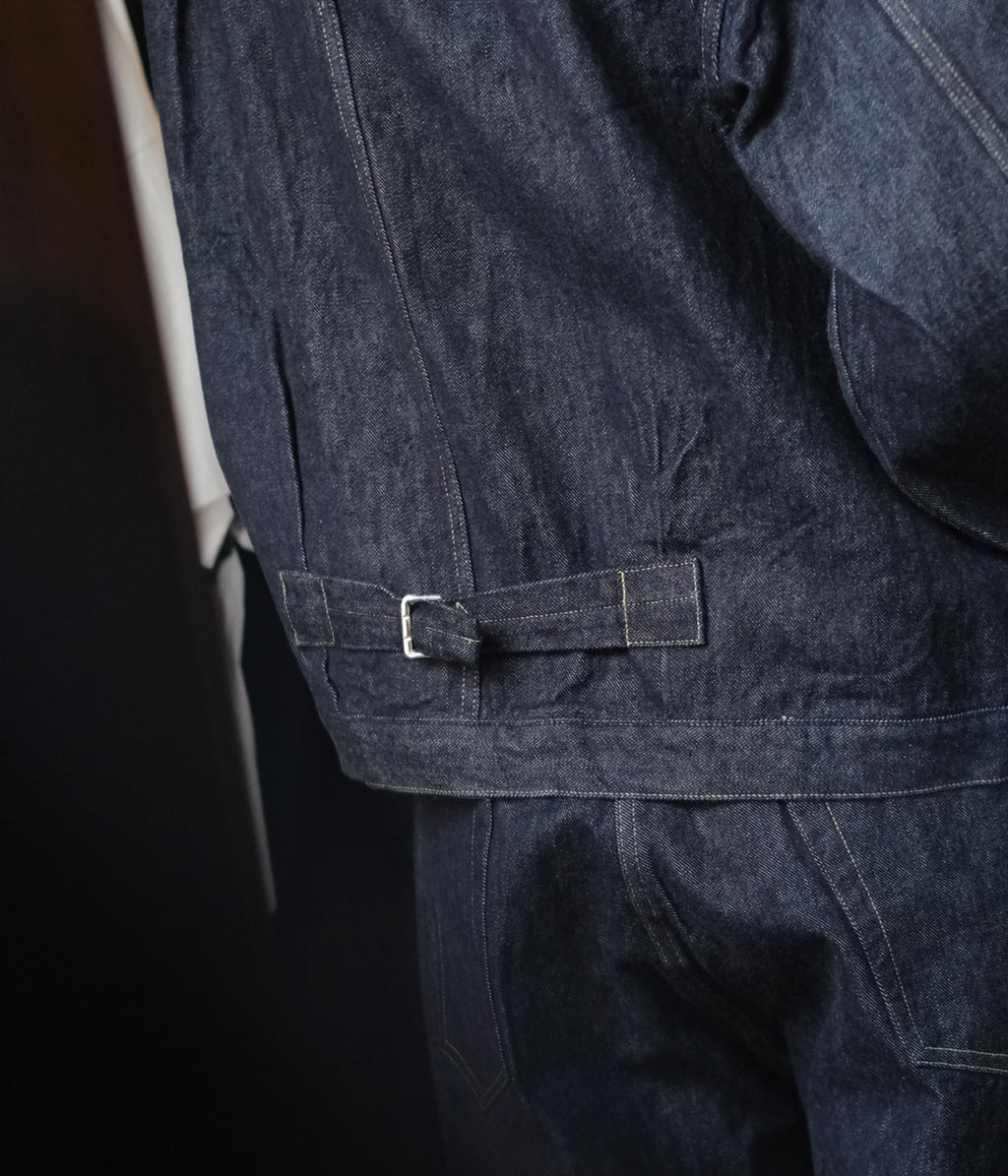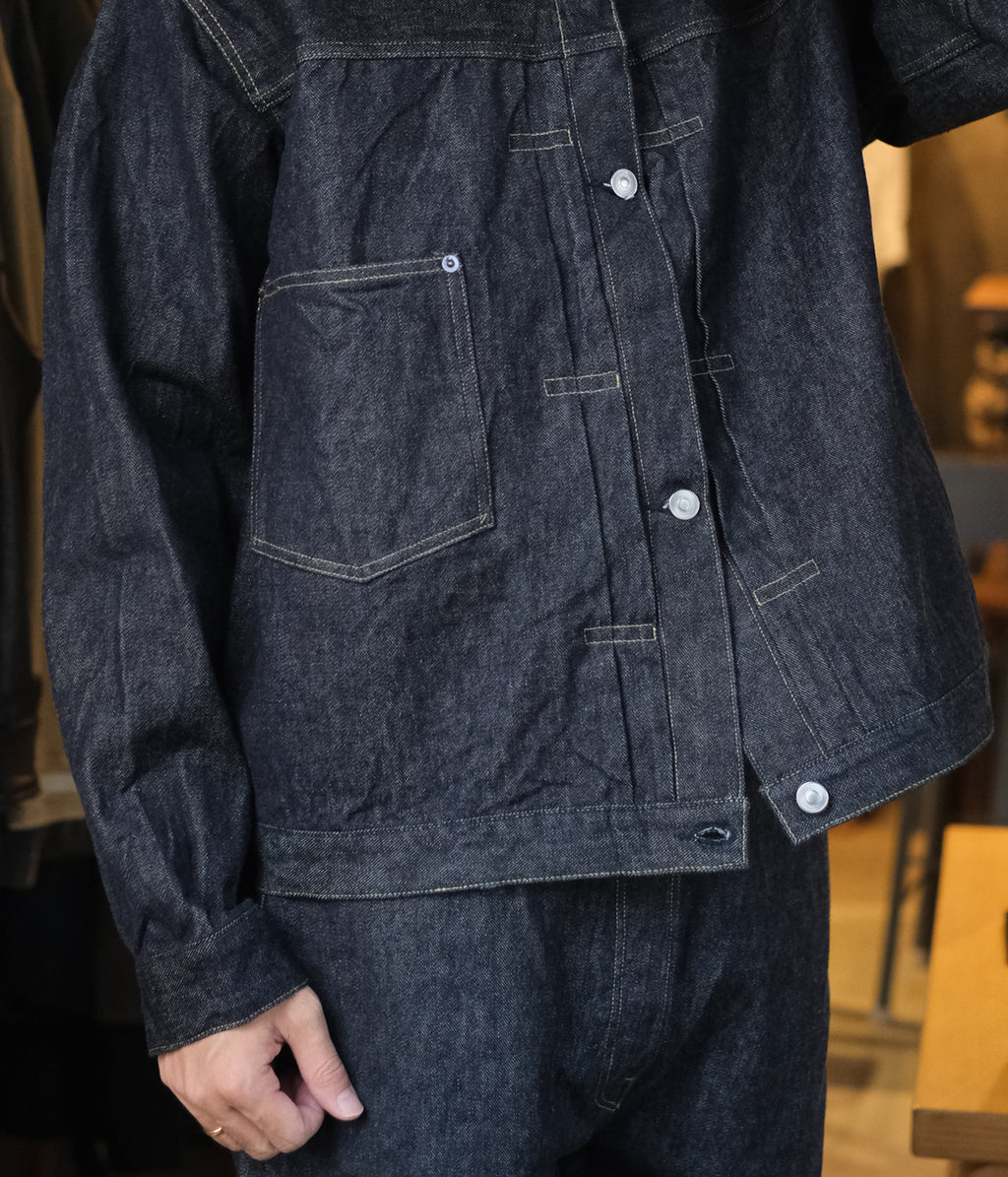 【デザイン】506XX大戦モデルがベース。釦の個数やポケットの形状、リベットの箇所やステッチの色などを踏襲しアレンジ。着丈を僅かに伸ばして、短過ぎず着やすい設定に。原型は肩傾斜が少なく、肩からアームホールにかけてシワが溜まってしまうが、肩傾斜を下げ、袖山を僅かに高くすることでシルエットを改善。