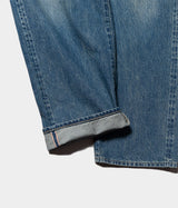 【デザイン】シンチバックやサスペンダーボタンが特徴の 1922 年モデルの 501XX をベースに、バランスを整えた太めのシルエット。股上を僅かに深くして、尻ぐりのくい込みを軽減させることで、バックスタイルを調整した。BIGINCHのデニムで稀に見られる、バックポケットが脇側に離れているバランスを活かし、完成されたデザインの中に遊びを入れている。オリジナルのタックボタンを使用。