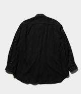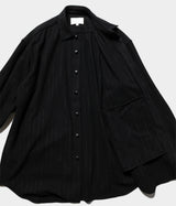 シャツのルックスで有りながらも、ジャケットの様な立体 的なパターンメイキングで仕立てました。大きくドロップしたショルダーライン、ゆったりと広い身 幅、力の抜けたルーズなサイズ感が特徴。便利なシームポケット付き。シャツにもアウターにもなる便利なアイテムです。