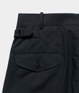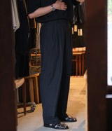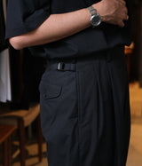【デザイン】某アメリカブランドの2プリーツトラウザーをベースにしたモデル。ディテールはサイドアジャスターやフラップ付きのコインポケットでクラシカルな印象でも、軽い生地に乗せることによって、野暮ったく見えず軽快な仕上がりにした。縫製も丁寧で、腰裏はオリジナルマーベルト仕様。