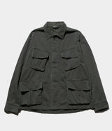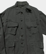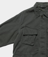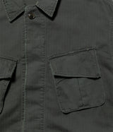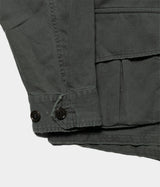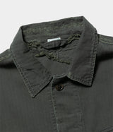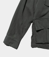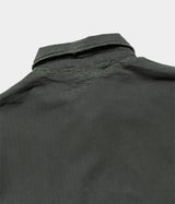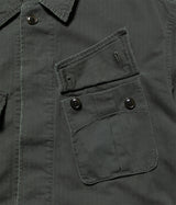 【素材】表地は経糸と緯糸にそれぞれ違う番手の糸を使用し、広すぎず狭すぎないヘリンボーンパターンピッチを採用。硫化染料で深いオリーブに染めた後に加工を施し、緯糸のムラ糸が自然なヴィンテージ感が出る様 に仕上げた。