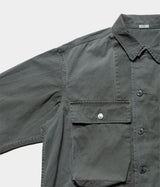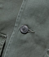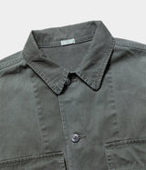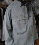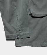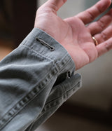 【素材】経糸は超長綿ムラ糸を双糸にして、緯糸はムラの強い糸とムラの弱い糸を交互に打ち込んで織ったヘリンボン。当時紡績技術が低かったゆえに生まれたヴィンテージ生地特有の経緯の自然なムラ感を表現。色落ちする染料を使用して染めることによって、超長綿の光沢感とヌメリ感がありながらもヴィンテージ感のあるヘリンボン生地に仕上げた。