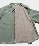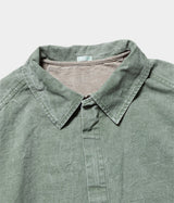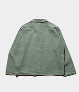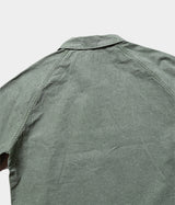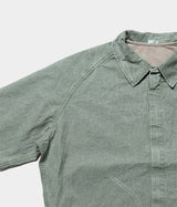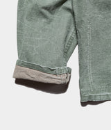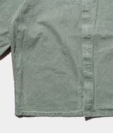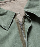 経糸緯糸共に強撚したオーガニックコットンの 10 番単糸を使用したコットンキャンバスに、表面と裏面 に違う色の顔料コーティングを施した表地を使用。 ヴィンテージの経年変化を再現するために、特殊な加工を施しシワ感のあるランダムなアタリと色落ち を表現。 元の所有者によって取り外されたポケットの跡を再現した、腰のポケットの針穴も特徴。