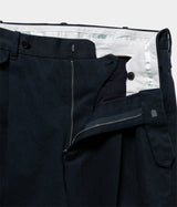 【素材】表地はオーガニックコットン 100% の毛羽立ちの少ない綺麗なコーマ糸を使用 し、超高密度に織り上げハリコシをもたせた。硫化染し、仕上げにヴィンテージ加工を施すことで生地にヤレ感が出て柔らかな風合いになり、経年変化も楽しめる素材。 一般的なチノクロスよりも太い番手の綾立ちのしっかりした高密度チノと、硫化染め、 ヴィンテージ加工を組み合わせ、独特で粗野な生地の色合いを表現。