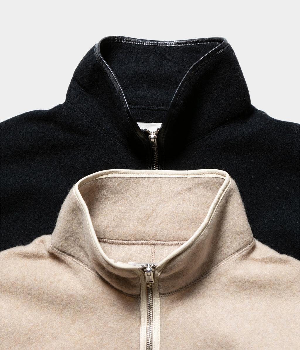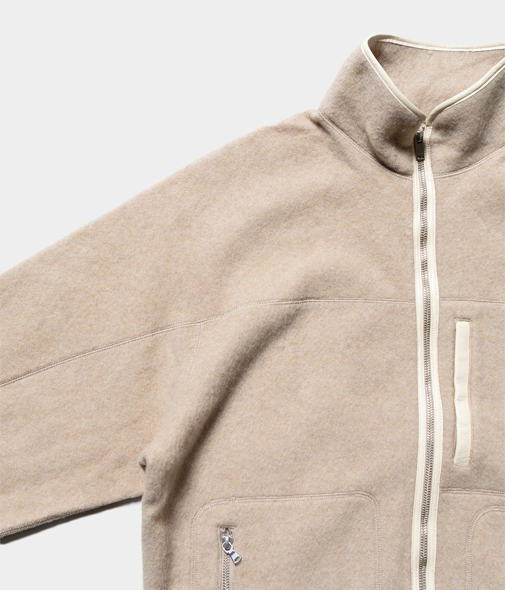 ループ面に2/60シルク、グランドに30/1 スパンリサイクルポリエステルを使用したシルクフリース。加工で両面W起毛+シャーリングを施しています。膨らみと軽さを出すため、あえてループ調も長く調整し、グランドにリサイクルスパンPEを採用し天然繊維のフリースにありがちな型崩れ、ダレ感を軽減しております。最終工程でグランドのPEを内側に納め、シルク感を全面に感じれるようしっかりと両面起毛を行い、その後 シャーリングで毛並みを揃え綺麗に仕上げています。
