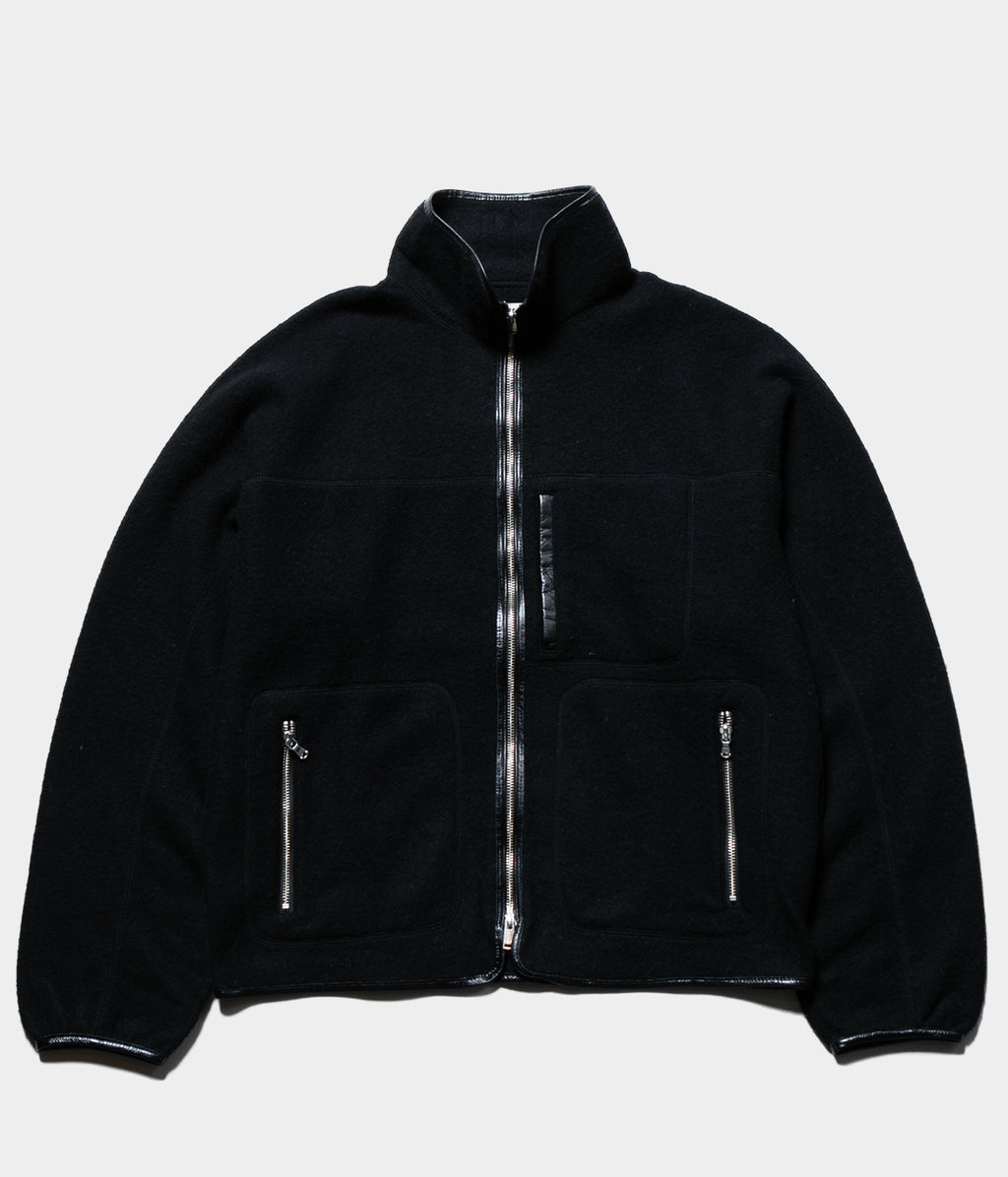 新型のフリースジップブルゾン。衿〜フロント〜裾、袖口にレザーパイピング始末しています。胸ポケットのポケット口もレザーでアクセントにし、腰ファスナーポケット。