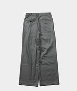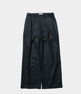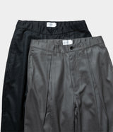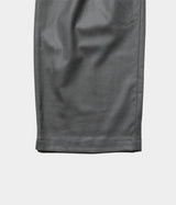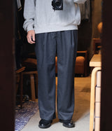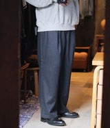 少しストレッチの効いたウールサキソニーを使用したインボックスプリーツのパンツを作成。すごく太いシルエットではないですが、ゆったりしたシルエットであまりテーパードはしていません。裾幅が広めなので、ボリュームのあるシューズと合わせるコーディネートにも相性がいいです。