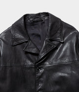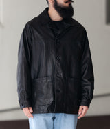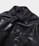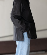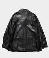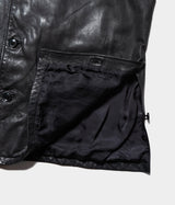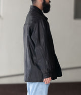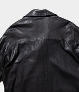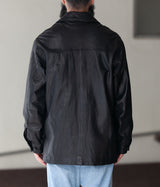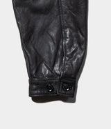 素材に独特なシボ感のあるゴートレザーを使用しています。見た目の重厚感とは裏腹に薄手で軽いので肉厚なレザージャケットとは違った感覚で着用できます。