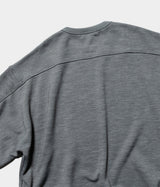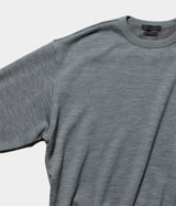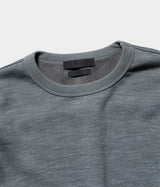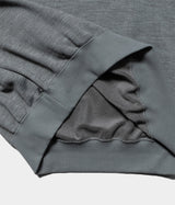 生地表面にウールを使用した贅沢な裏毛。肌側に当たる綿は双糸を使用していることと、密度が高く毛足の⻑いループにすることで、高い嵩高性を持たせています。 表と裏をつなぎ合わせる糸は、捲縮の高いナイロン糸を使用しており、キックバックのある着心地の良い裏毛にしております。 ナイロンはリサイクルナイロンを使用して環境にも配慮。加工では特殊な酵素で毛羽を少なくし、シリコン系の高級柔軟でヌメリ感を増しています。