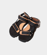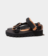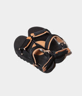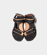Strap sandals combining nylon tape and 3mm-thick cowhide leather. The sole of the sandal is made of cowhide leather shoulder, so it is comfortable to the touch and can be worn without getting damp. The shark sole is made of EVA material, so it is light and has a good return.