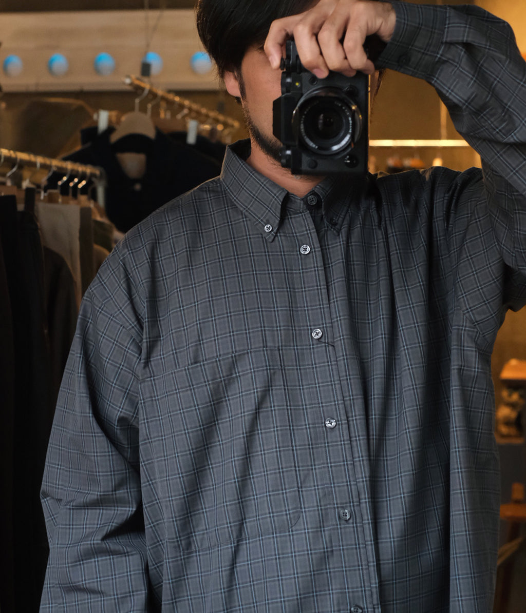 This oversized button-down shirt features a large chest patch pocket with a small mobile pocket inside, adding a simple yet practical detail. It also features action pleats on the sleeves, a characteristic of military wear, for easy casting. It also comes with a sunglasses holder.