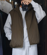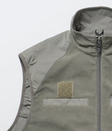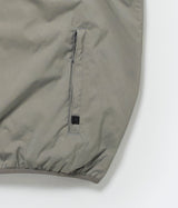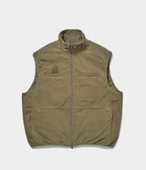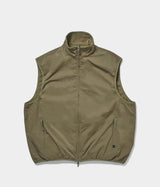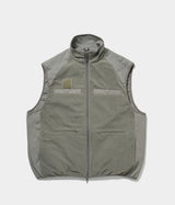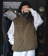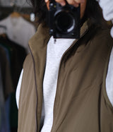 The warp yarn is made from recycled polyester to give a soft, fine powder touch texture. The high-density weave creates an elegant material. This stand collar vest is inspired by the ECWCS layering system of the U.S. military. While incorporating military design, the combination fabric of block fleece and nylon taffeta allows the front and back sides to be worn in completely different ways.