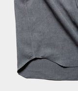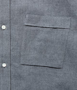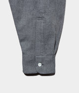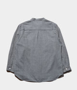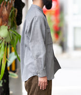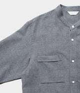Band collar shirt in cotton wool chambray. It's lightweight and comfortable to wear, and the chambray effect gives the fabric a distinct look, making it great to wear alone. The key point is that by creating a placket, it looks like a pullover when you close it and wear it.