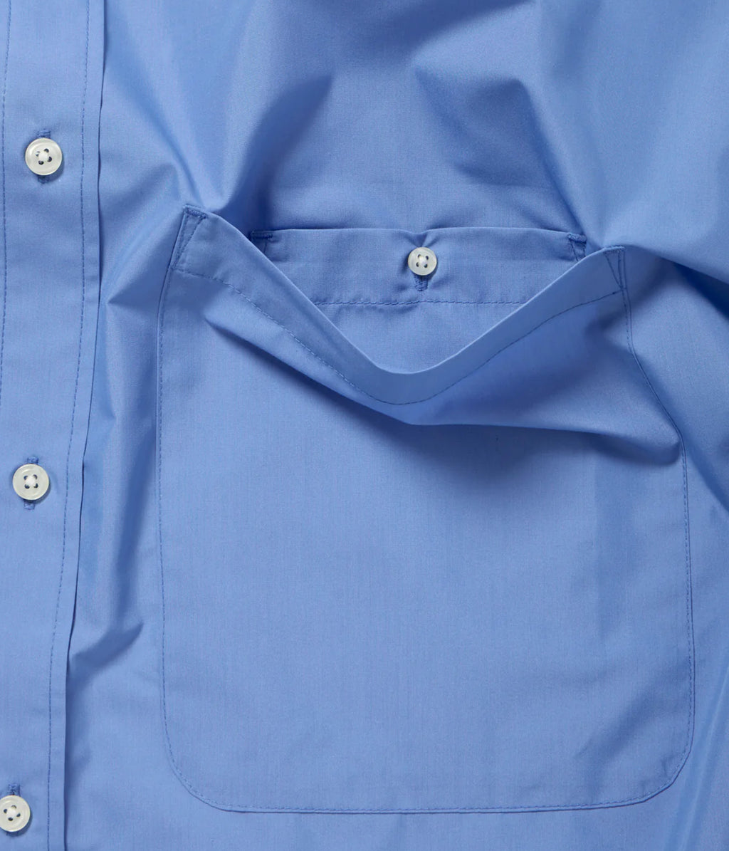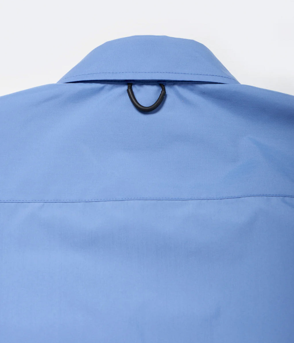 This oversized shirt features a regular collar and features a large chest patch pocket with a small mobile pocket inside, adding simple yet practical details. It also features action pleats on the sleeves, a characteristic of military wear, making it easy to cast while fishing. It also comes with a sunglasses holder.