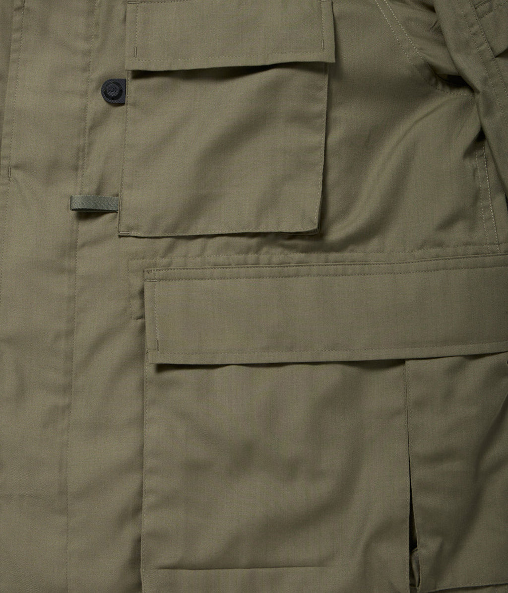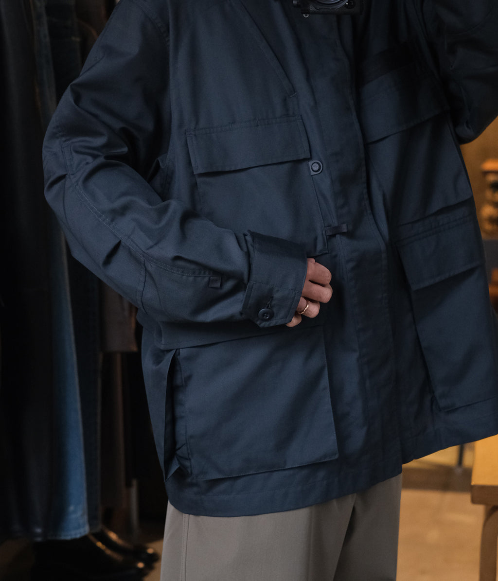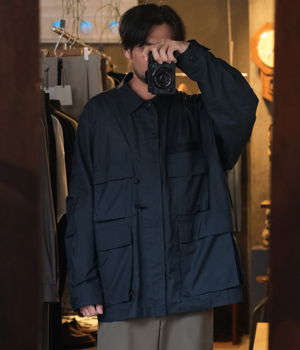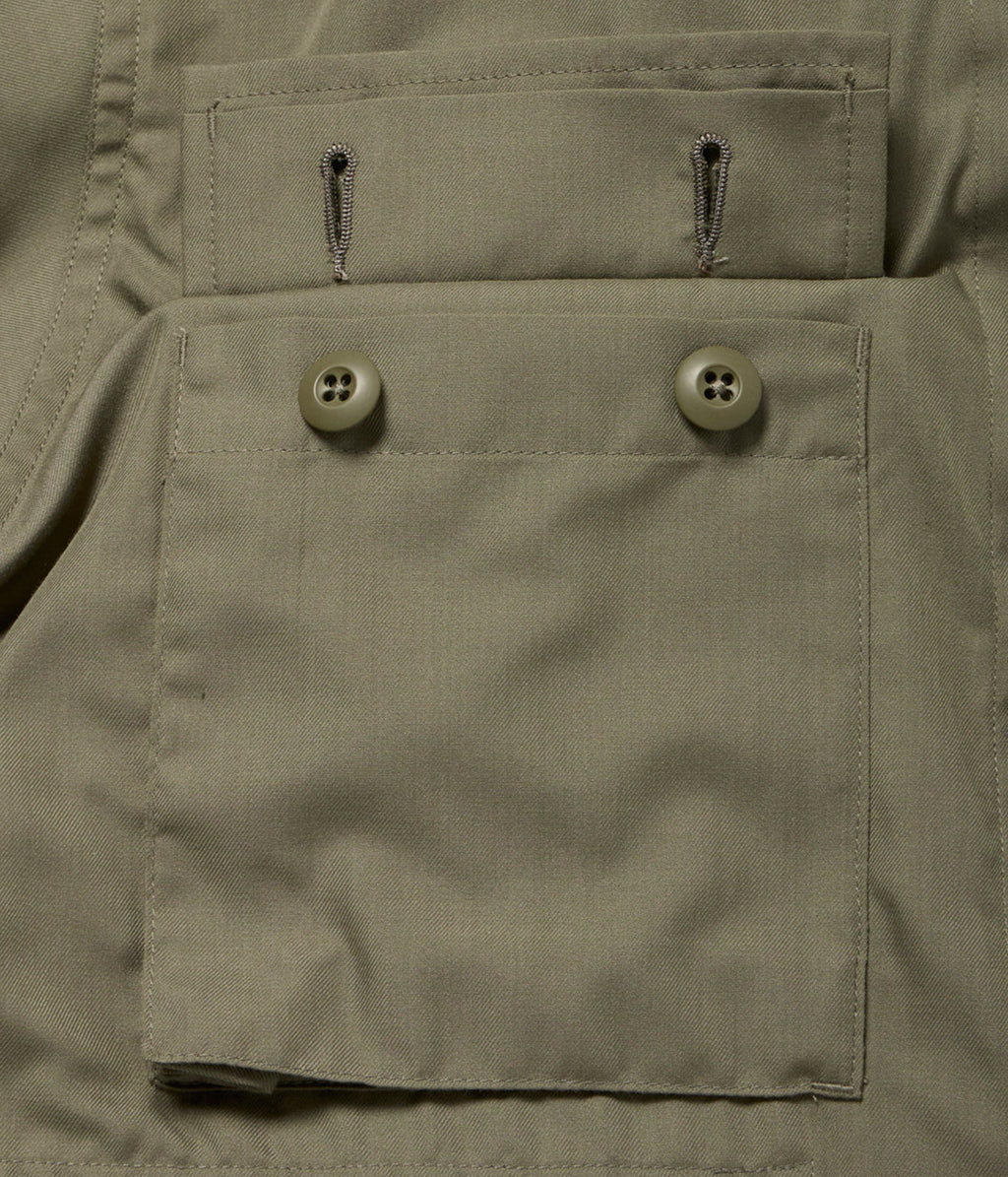 シャツ生地を使用し一枚仕立てでライトウェイトにデザインしたミリタリーフィールドシャツジャケット。サイドに跨るフロントポケットは、ハンティングのポケットワークよりインスピレーションを受けデザイン。軽量ながらも胸ポケットやジッパーポケットなど種類様々なポケットワークを施した。ミリタリーウエアの特徴である袖のアクションプリーツを加え、フィッシングの際キャスティングしやすいディテールを追加。