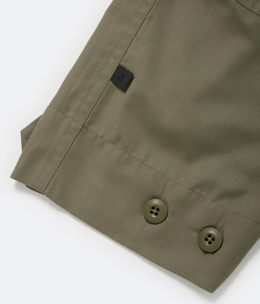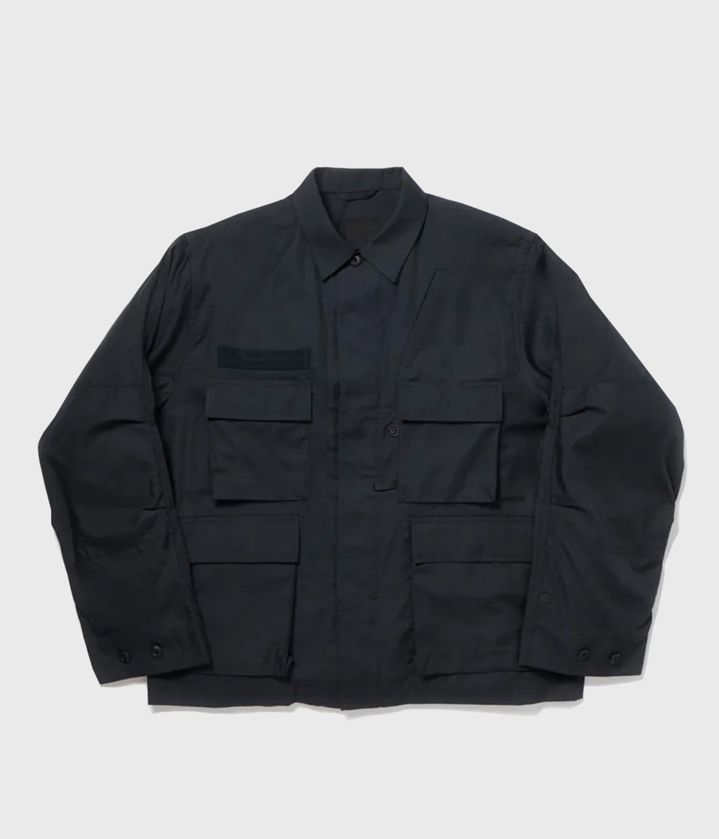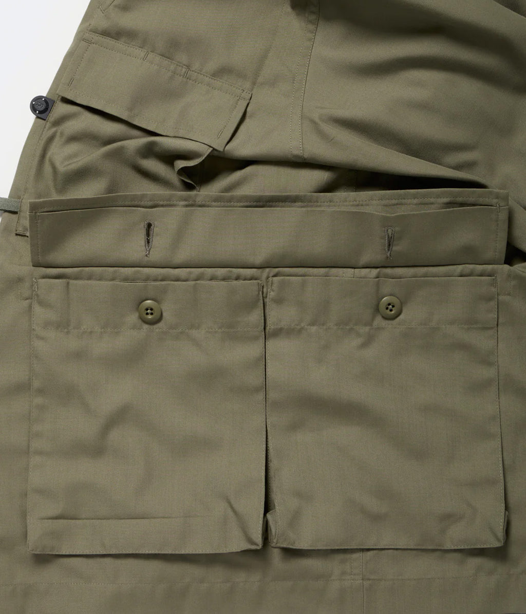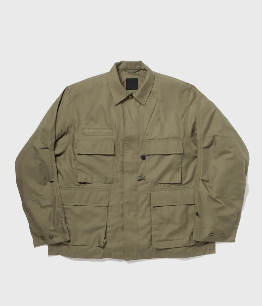 シャツ生地を使用し一枚仕立てでライトウェイトにデザインしたミリタリーフィールドシャツジャケット。サイドに跨るフロントポケットは、ハンティングのポケットワークよりインスピレーションを受けデザイン。軽量ながらも胸ポケットやジッパーポケットなど種類様々なポケットワークを施した。ミリタリーウエアの特徴である袖のアクションプリーツを加え、フィッシングの際キャスティングしやすいディテールを追加。
