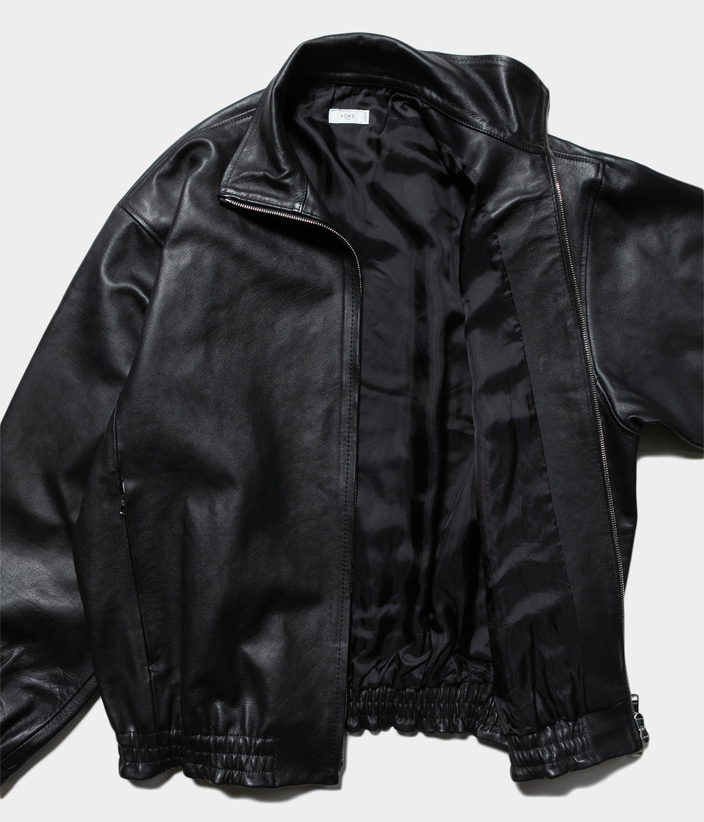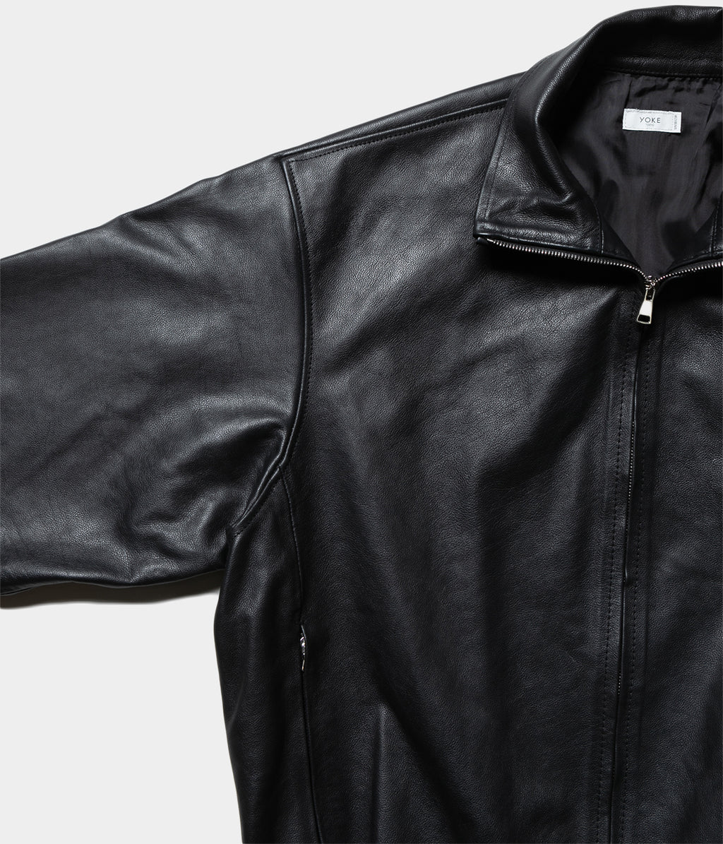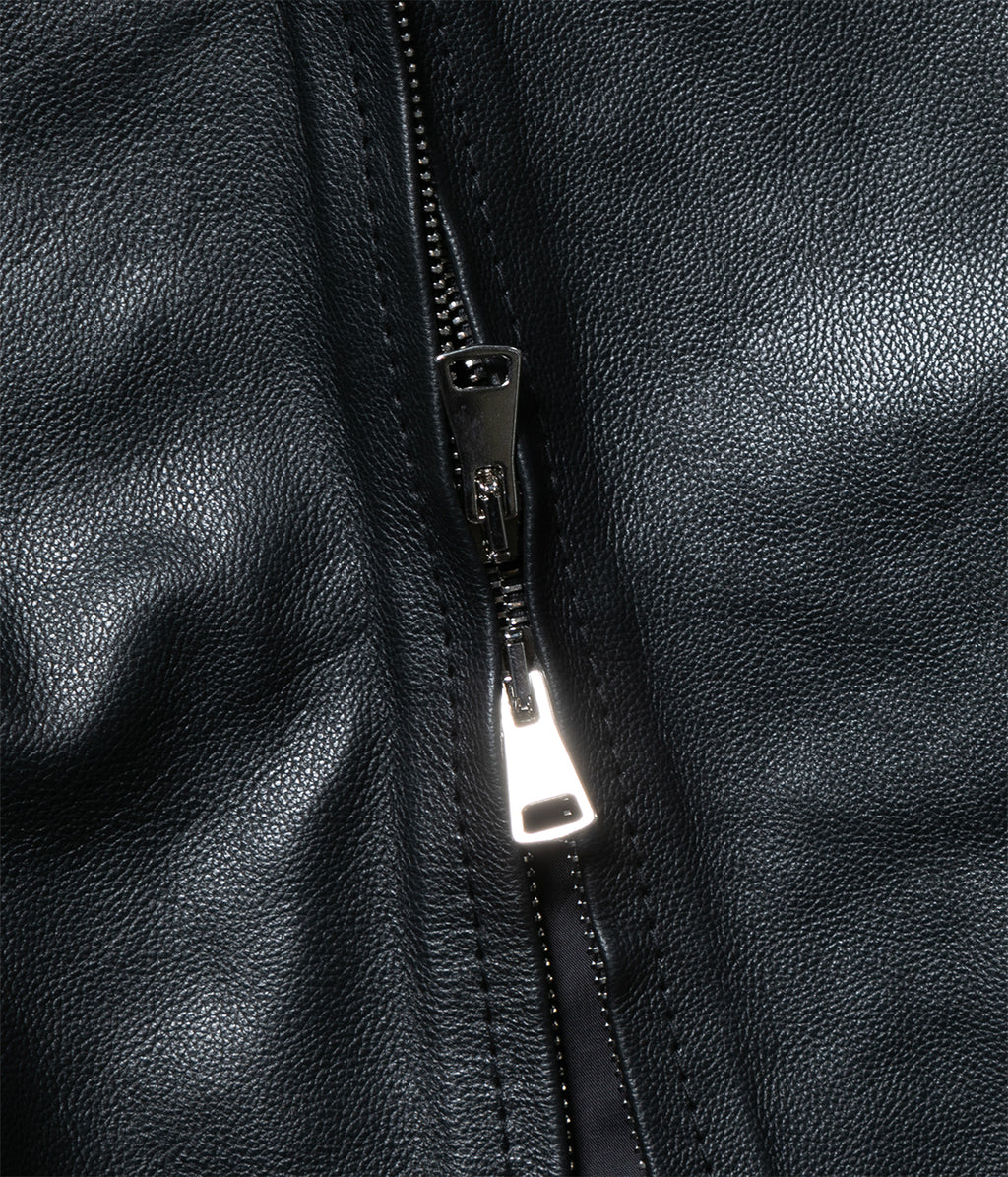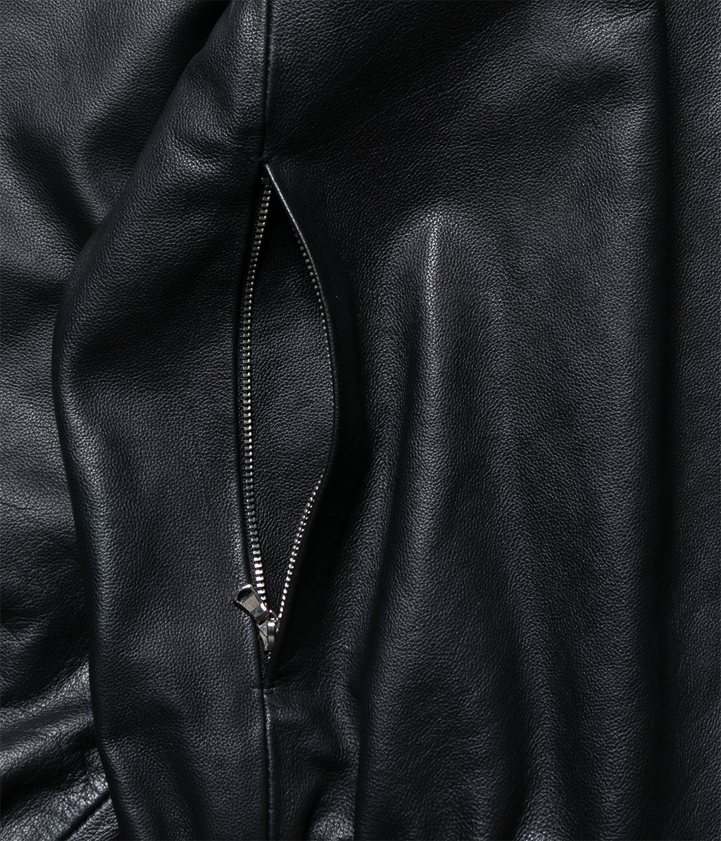 で展開していたシープナッパランレザーの素材替えです。裾と袖口はゴム入り、フロントにはイタリアの高級なRaccagniのダブルジップを採用。裏地はコットンキュプラを使用した総裏仕立てです。