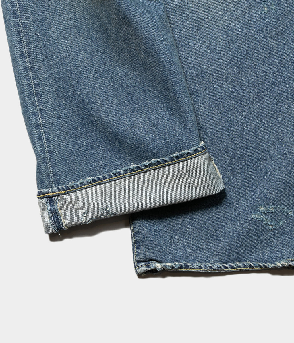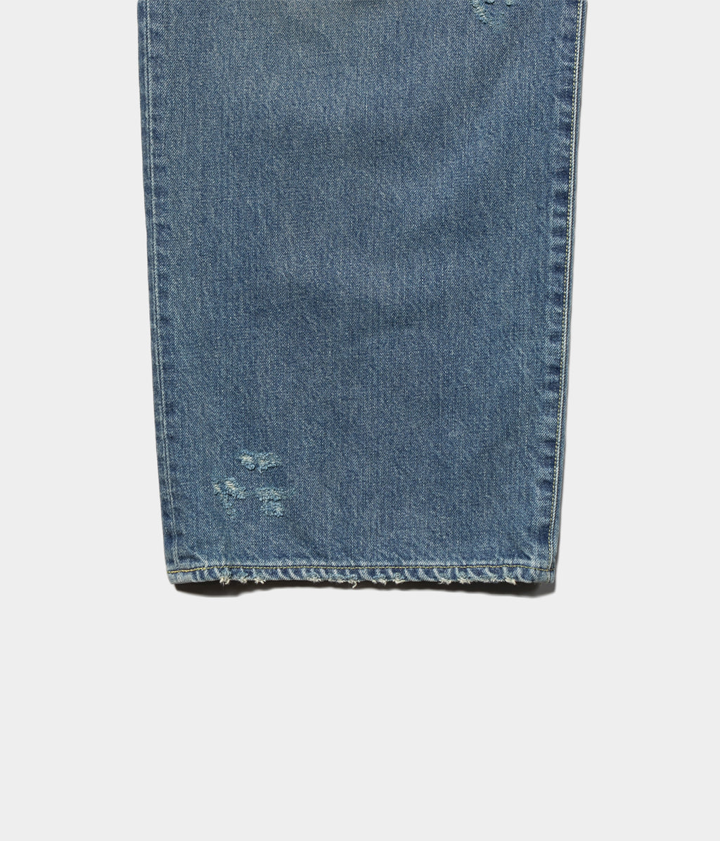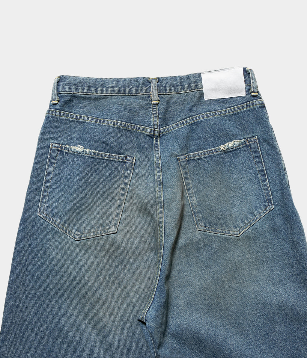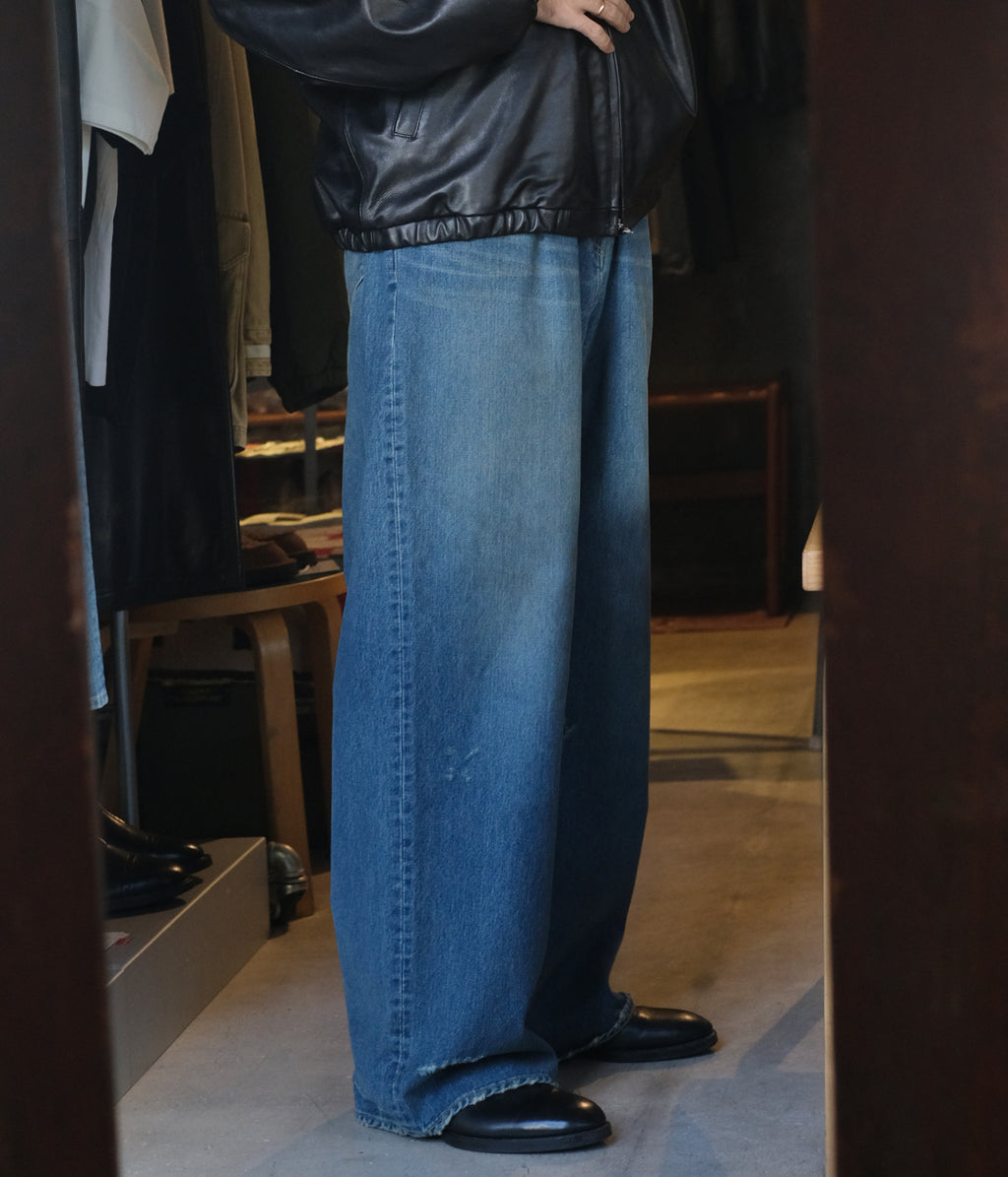 股上を深くとった独特なワイドシルエットが特徴のバギーデニム。様々な加工を施し、奥行きのあるデニムの表情に仕上げている。ベルトループから縫製箇所まで細かく入るダメージ感も魅力。ウエスト内側はドローコードの仕様。