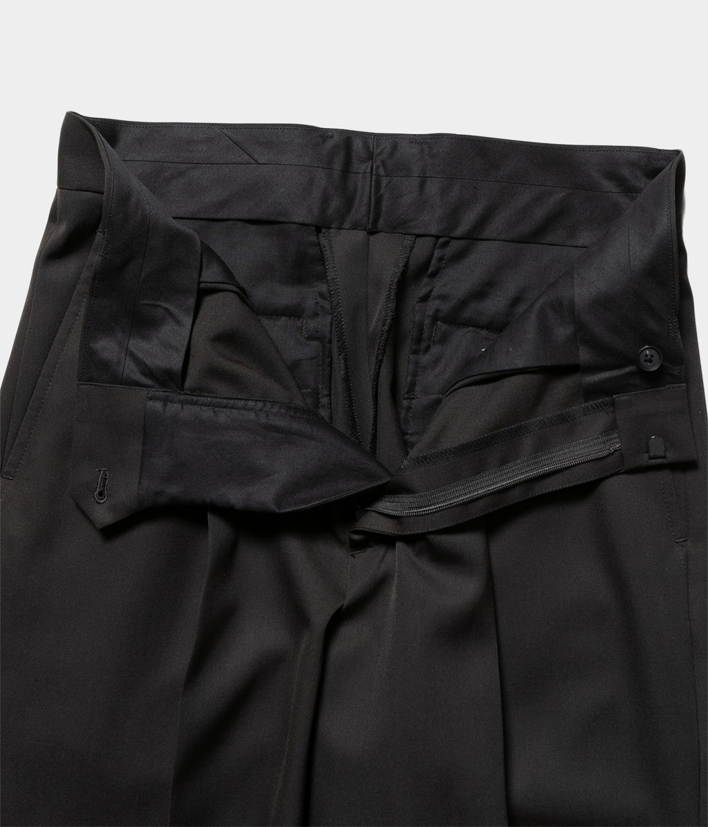 原料を使用し、高密度に織り上げ後染めしたオリジナルウールギャバジン。オフスケール加工、特殊樹脂加工を施すことで色目は濃く深く染まり、ハリ、コシを持たせた独特な風合いに。