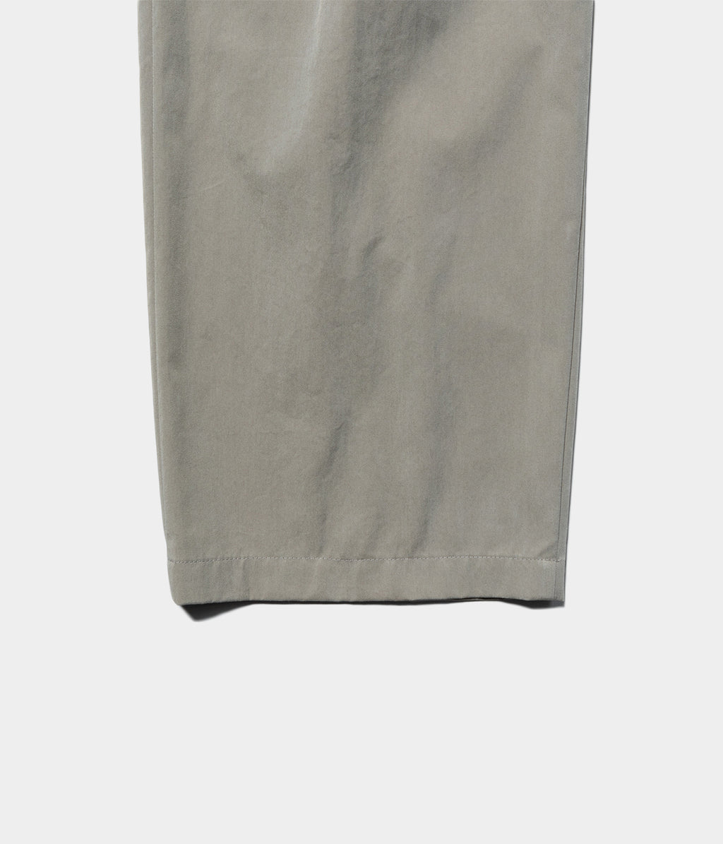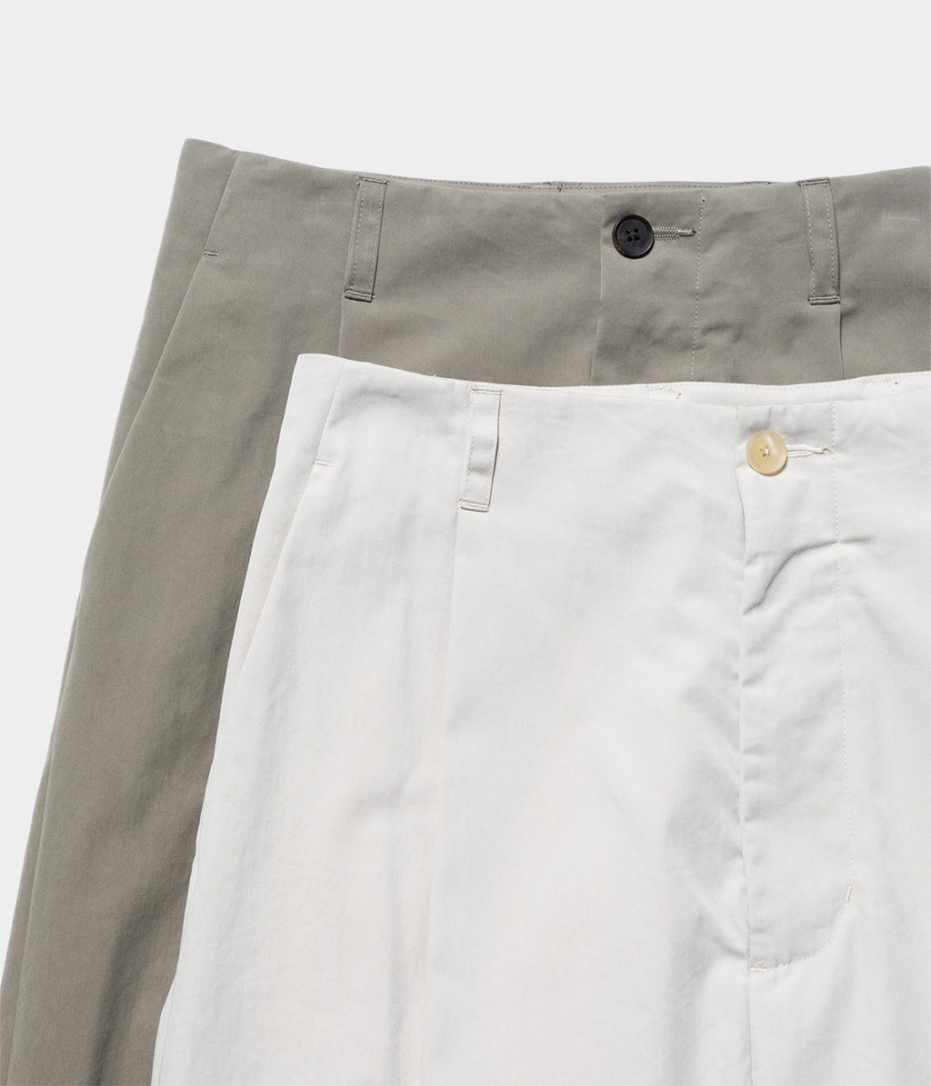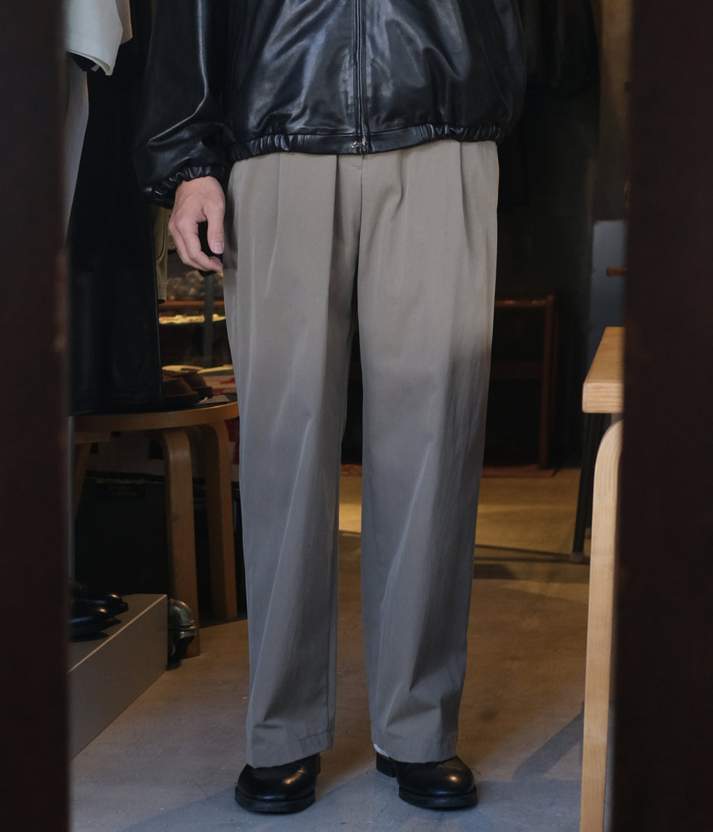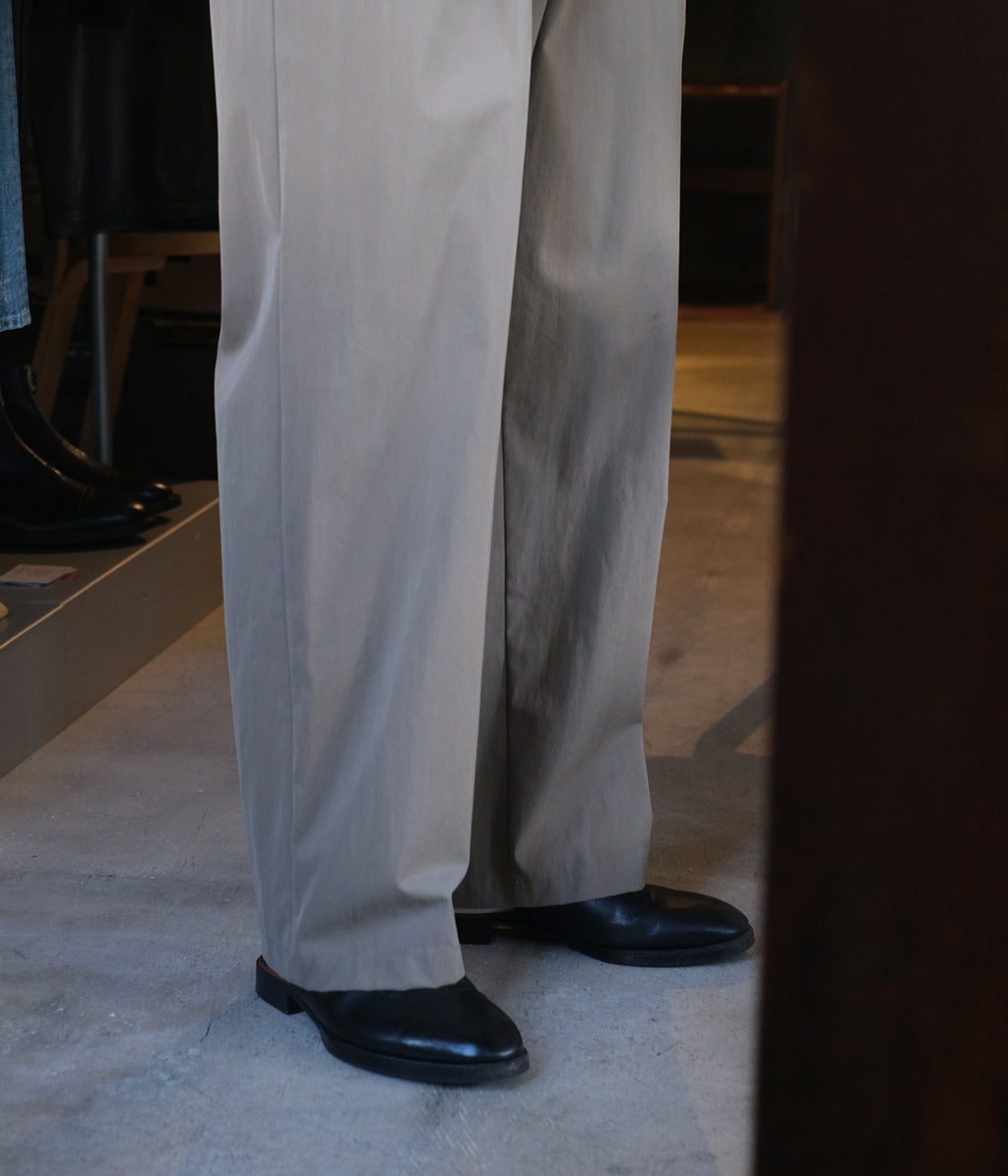 新型のコットンナイロンヴィンテージツイルを使用した1タックワイドテーパードトラウザーズ。ベルトレスでウエストにステッチを無くしているミニマルな印象を持たせたオーセンティックな雰囲気に、深めのアウトタックと、腰回りはゆったりとさせたワイドテーパードシルエットは色々なスタイルに合わせやすいです。