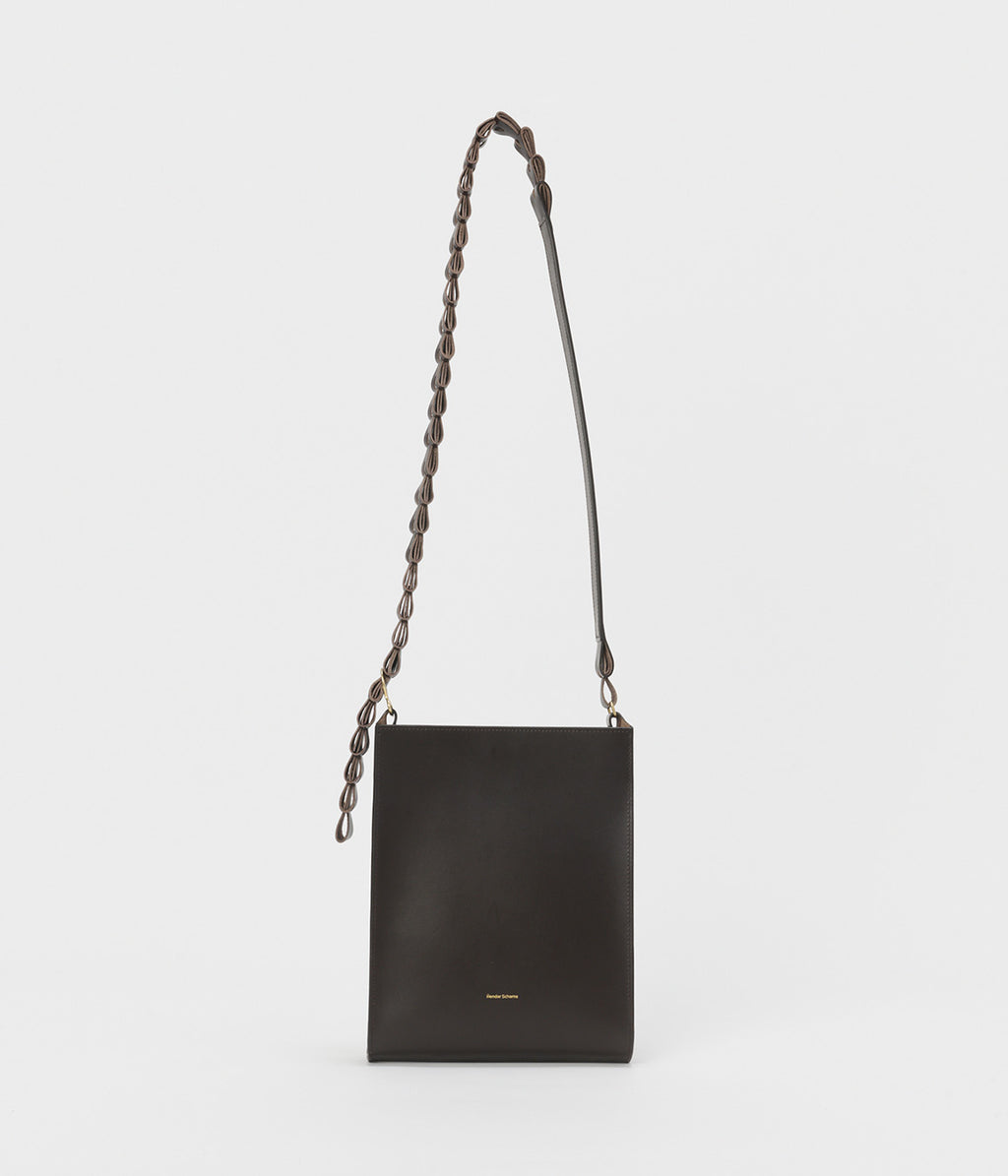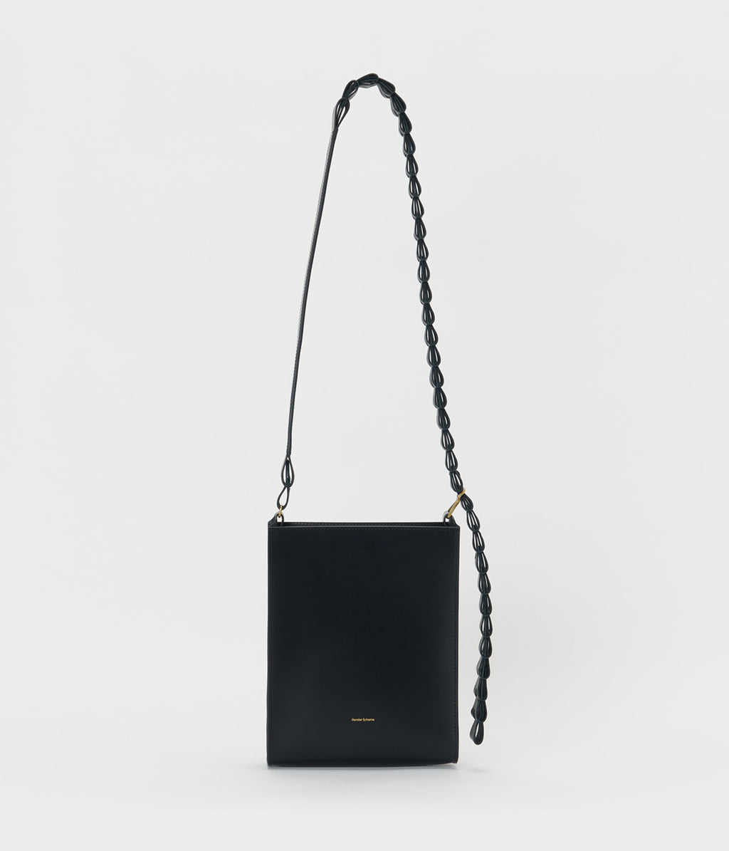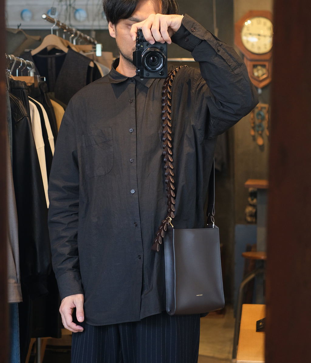 「construct bag」は、ボックス型のミニショルダー。立体感のあるストラップには、「ダルマ引掛け」と呼ばれる金具を用いており、金具を掛ける位置を変えるだけで、ストラップの長さ調整が可能です。この仕組みによって、ストラップがデザインそのものとなり、機能性とデザイン性が高いレベルで融合するプロダクトに仕上げました。