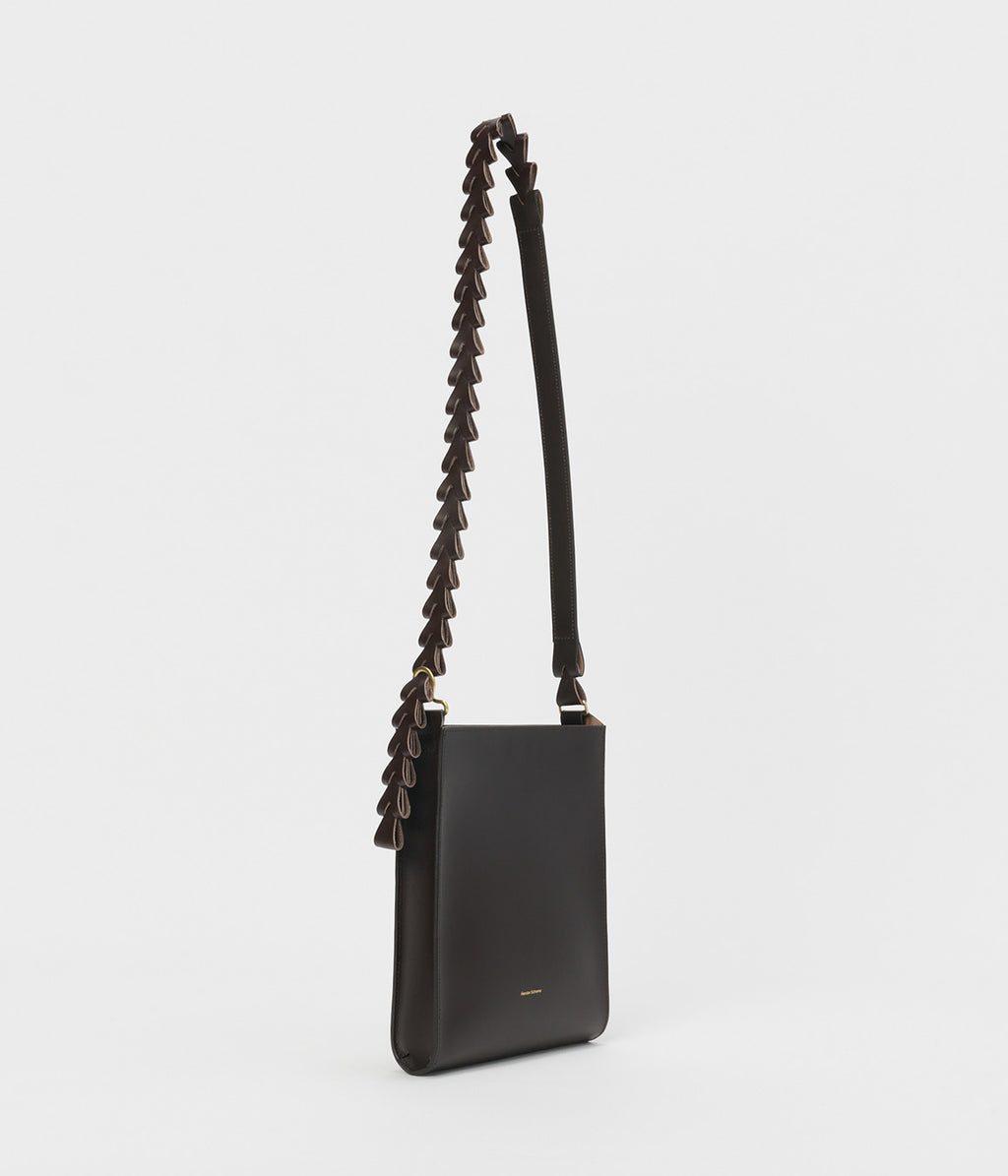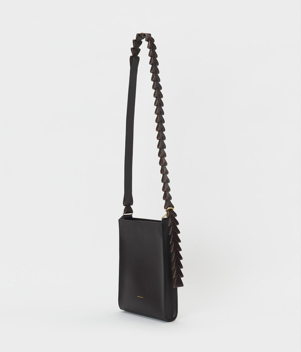 ストラップの構造そのものを主役とした「construct」シリーズは、三角形のレザーピースを連結して構成された独自のストラップが特徴。視覚的なアクセントとなるだけでなく、パーツの着脱によって長さの調整や、部分的なリペアが可能。また、レザーの端材を無駄なく活用することで、制作工程においてもサステナブルなアプローチを実現しています。