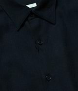 【デザイン】フレンチフロントのレギュラーカラーシャツ。ゆったりとしたオーバーサイズシルエット。身頃のボリュームに対してやや小ぶりな襟のバランスが特徴。装飾には小さく削り出したシャツサイズのホーン釦をデザイン。