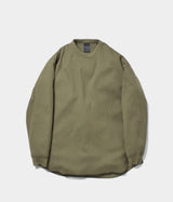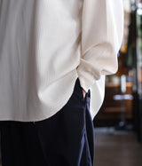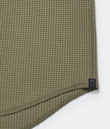 2種類の違うポリエステル原料を使用することで糸にバネのような効果を持たせたストレッチ素材のため、密度が詰まったハリのあるコットンタッチなワッフル素材になります。