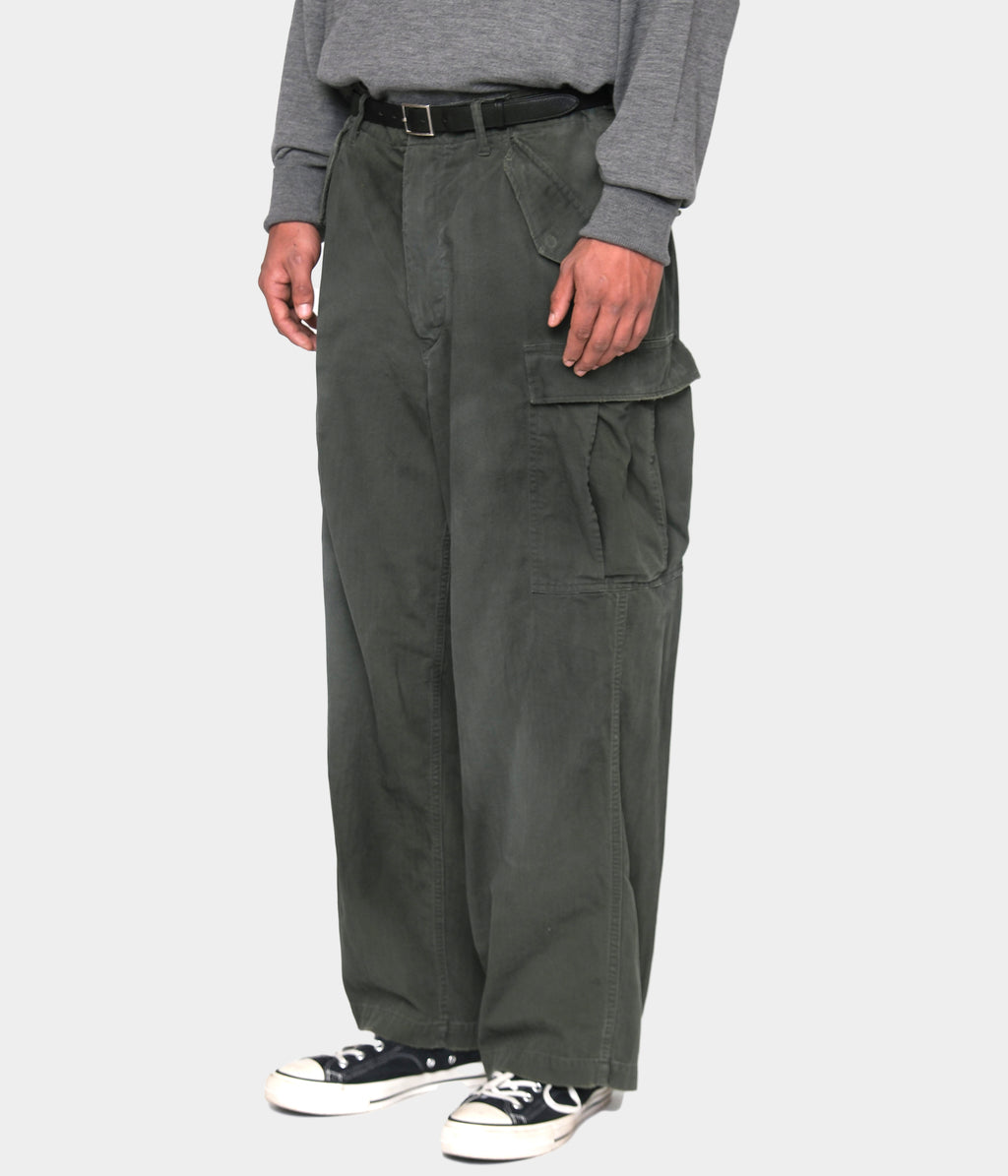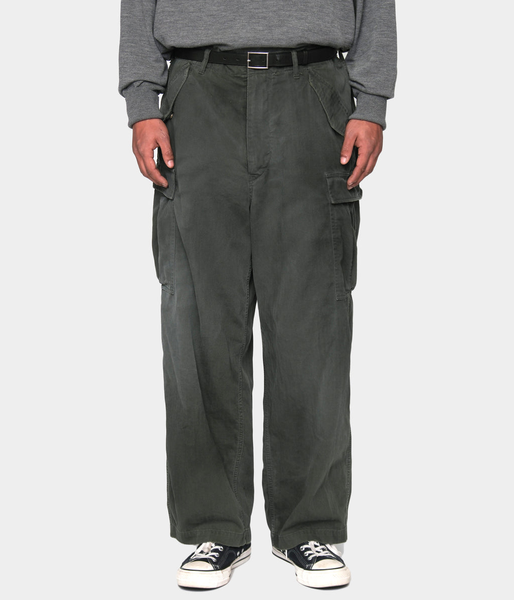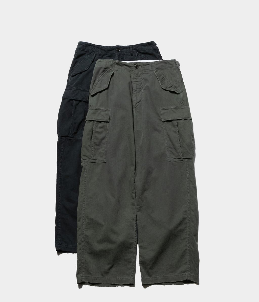 【デザイン】US Army M-51 Field Pantsがベース 膝のタックが無いイレギュラーのパンツをベースにしている。サスペンダー釦やウエストテープも排除し、ウエストデザインは簡素化し着易くアレンジしている。原型よりもワタリと膝幅を広げたボリュームのあるワイドテーパードシルエットのアレンジしている。