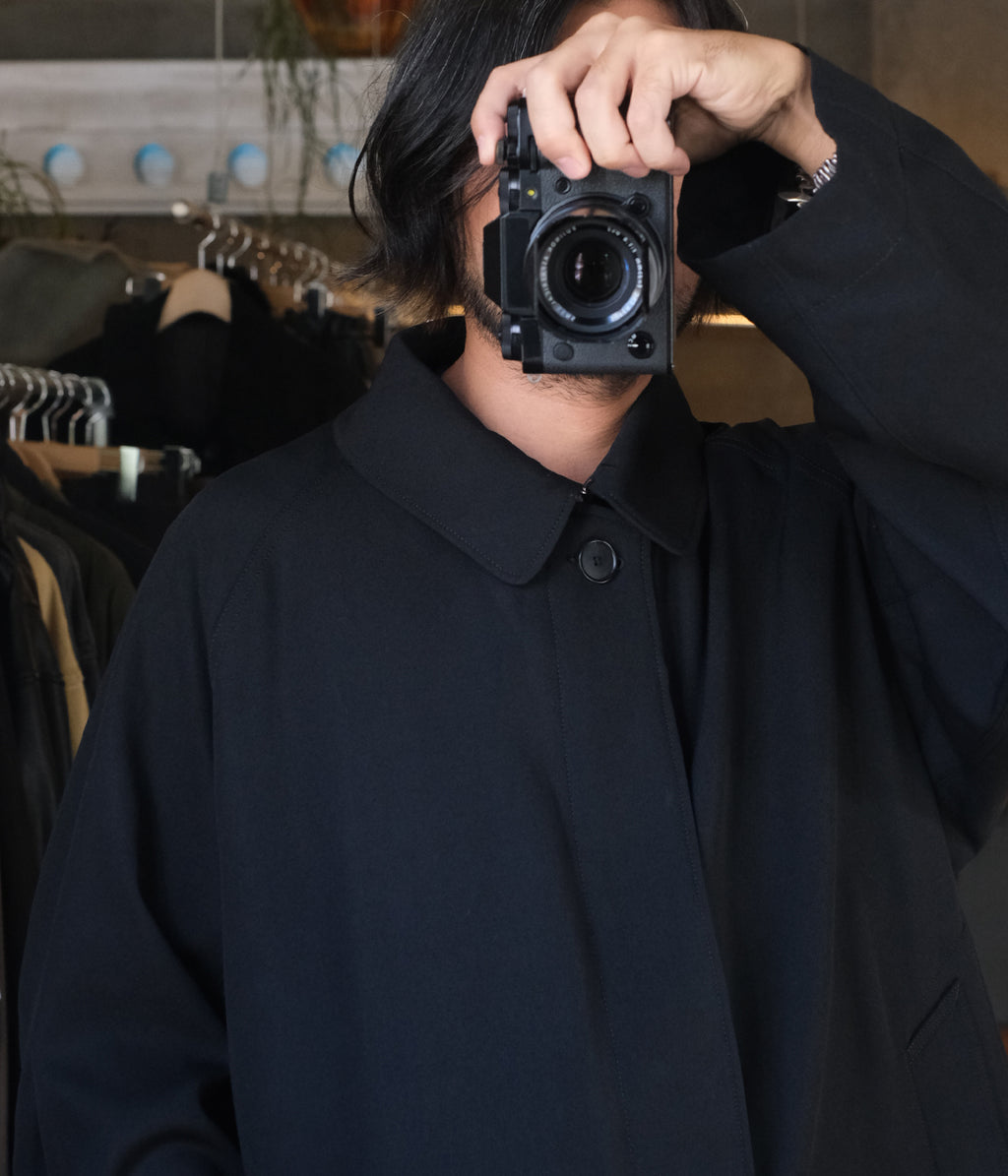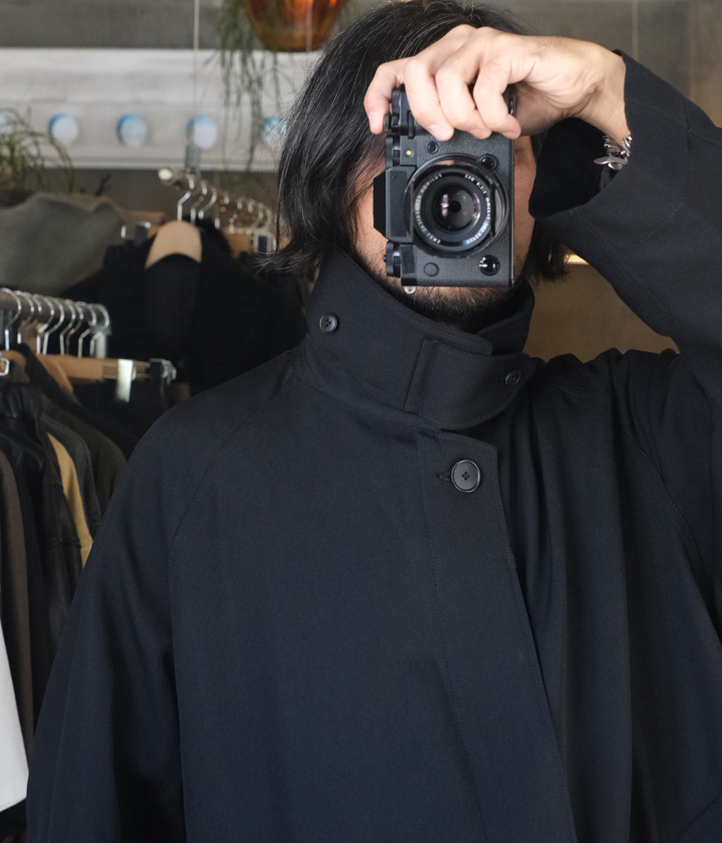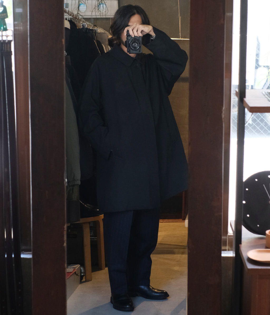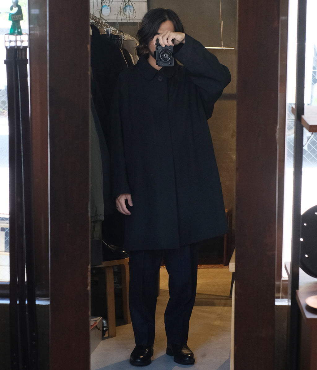 ブランド定番のオーバーコート「Albert」。フランスの1940年代のオーバーコートがベースになっています。美しいラインを描くラグランスリーブ、可動域を確保した立体的な作りの3枚袖が特徴。襟を立ててスタンドカラーでの着用も可能で、体型を選ばず自然に馴染む肩の設計となっています。シルエットはたっぷりとした身頃と短めの丈のバランスになっていて、パンツのシルエットを選ばないAラインが特徴敵です。