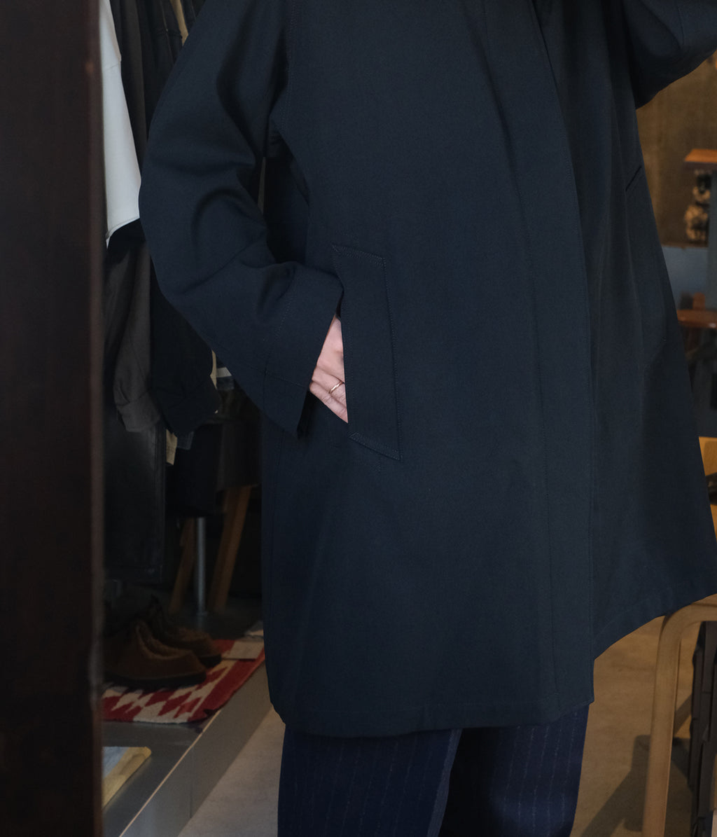 素材は創業150年の尾州の機屋に別注したフォーマル由来の伝統的なギャバジンの生地を使用しています。ハリ感と上品さを兼ね備えた生地です。
