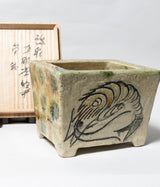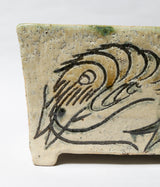 こちらの作品は金城次郎を代表する海老の線彫と三彩点打ちの平角鉢です。