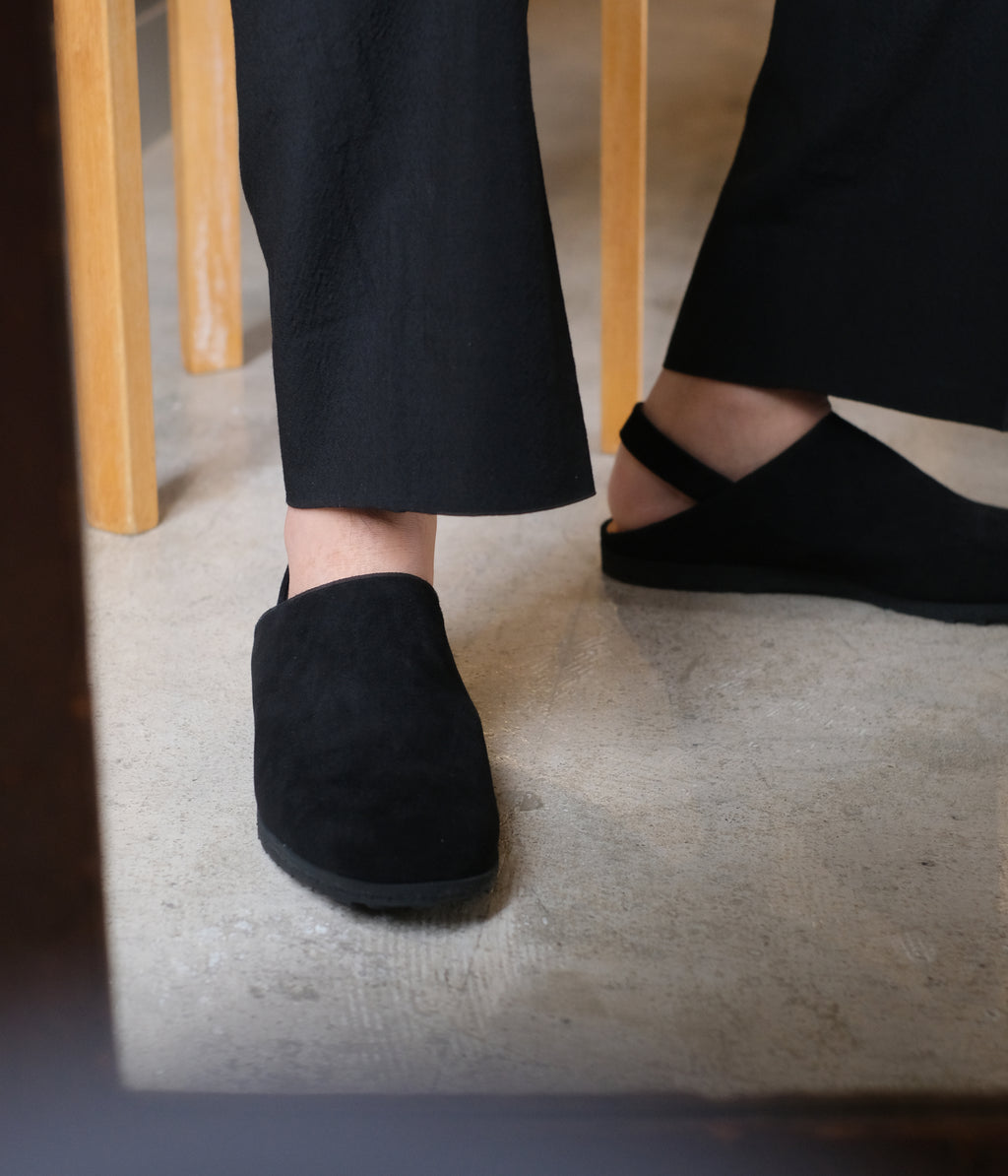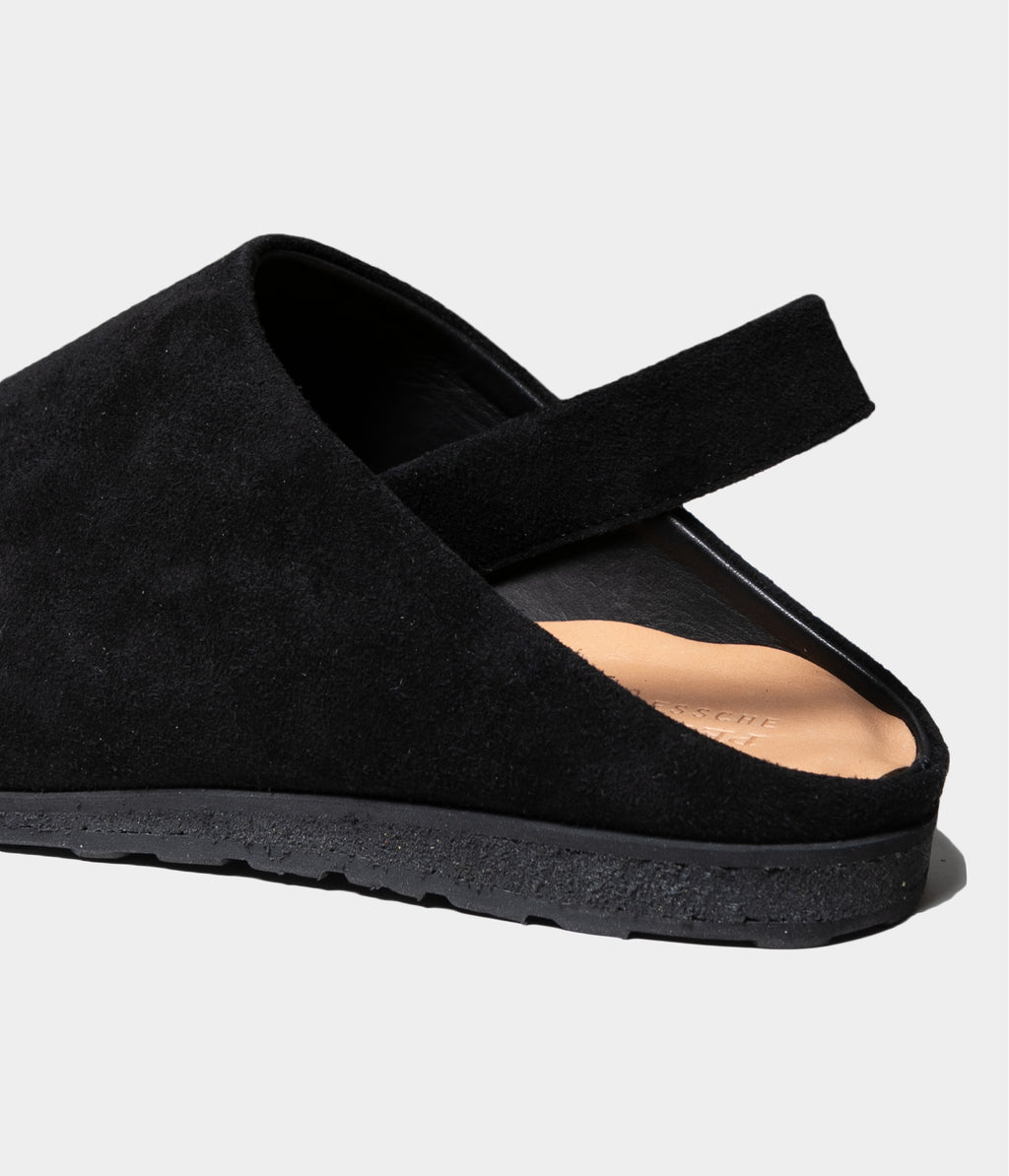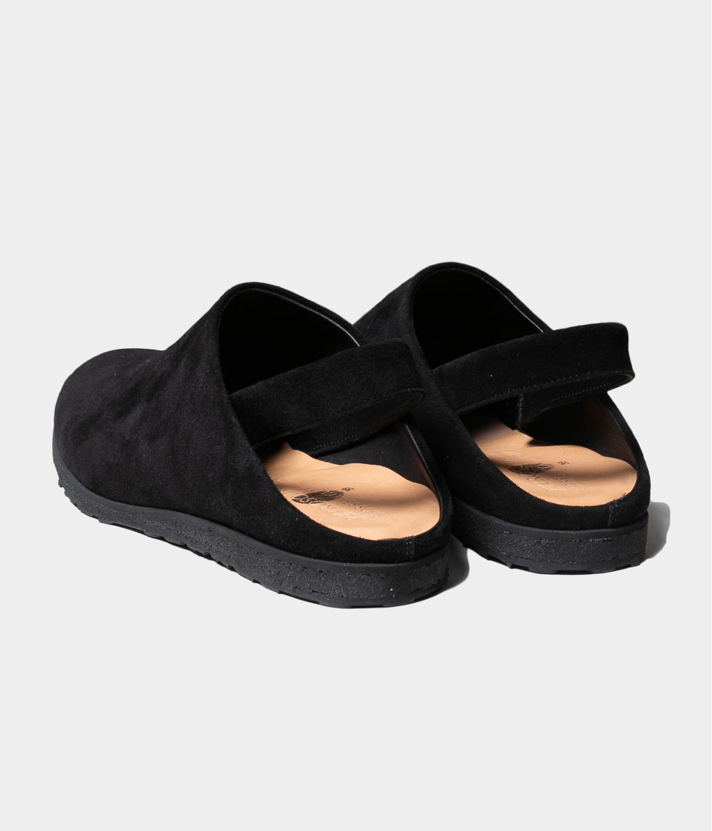 サボ型のシューズで、かかとにはストラップが付いています。ストラップはゴム仕様のため、脱ぎ履きがスムーズで、しっかりとしたホールド感があります。