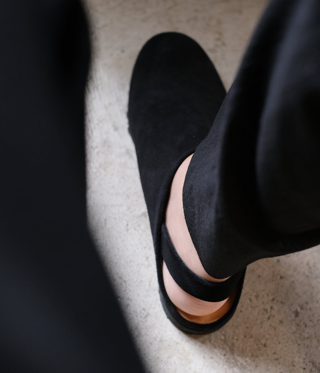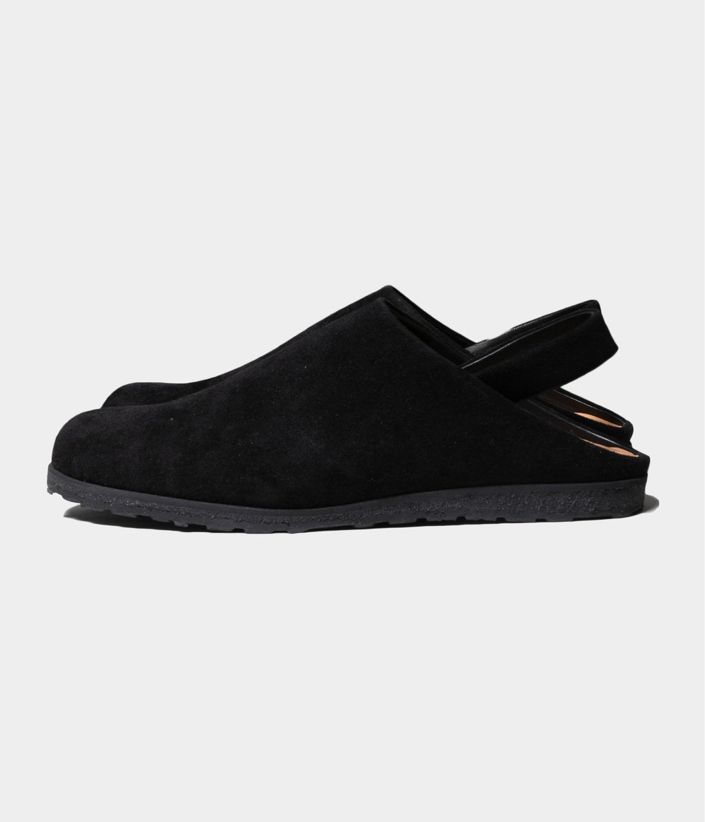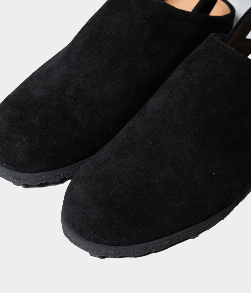 サボ型のシューズで、かかとにはストラップが付いています。ストラップはゴム仕様のため、脱ぎ履きがスムーズで、しっかりとしたホールド感があります。