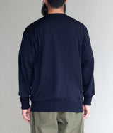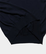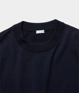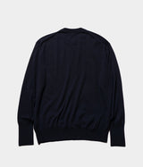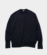 カットソーのロン T やスウェットの様にカジュアルにも、ハイゲージニットの様にクロージングスタイ ルにも合わせることが出来るクルーネックニット。 全体的にゆったりとしているが襟ぐりは狭くコンパクトに、袖口と裾のリブをきつく提灯の様に編むこ とで綺麗なシルエットに設計。 14.5 マイクロン(super170's)のウール糸を使用し、14 ゲージの度詰めで天竺編みしている。