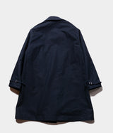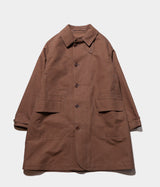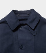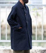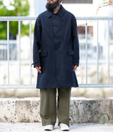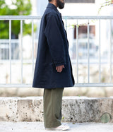 Aラインのコートになるように着丈を伸ばしてアレンジしたカナダ軍のモーターサイクルコート。 袖口のストラップやフロントの二重前立て等の象徴的なディテールはそのままに忠実に再現し、襟は一 回り大きくし、立てて着用した際の形の綺麗さ強調。 表地は超高密度で織った二重織りモールスキンで、「密度」と「厚さ」の限界に挑戦したもの。緯糸に二 種のオーガニックコットン糸を使用し、表面には高密度感、裏面には肉厚感を表現。 仕上げ工程でスエード起毛とニドム加工を施すことで余分な毛羽を取り除き、高密度でありながらヴィ ンテージ感と柔らかな肌触りがある素材。