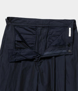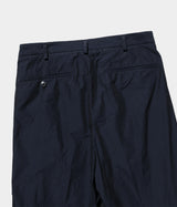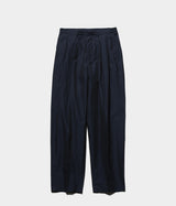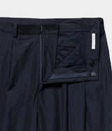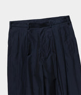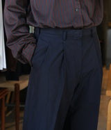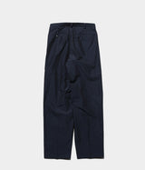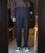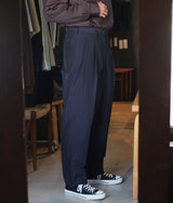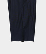 全体のフォルムは、カジュアルなパンツの作りとは違い、ドレス仕立てのパンツをベースに作り込んでいるため、前から見るとスッキリとした細身に見えるのが特徴的です。サイドから見るとたっぷりとした渡り幅と膝幅にかけてワイドシルエットを表現しています。