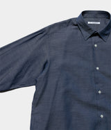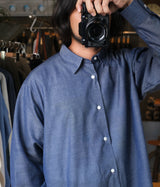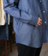 定番のレギュラーカラーシャツ CHARLES をリラックスフィットにアップデート。綿/ポリエステル/レーヨン用いたシャンブレー素材で、滑らかな肌触りと上品な光沢感やドレープ性があります。また硫化染めの独特の風合いや変化をお楽しみいただけます。薄手の生地感で、通年で着用が可能です。