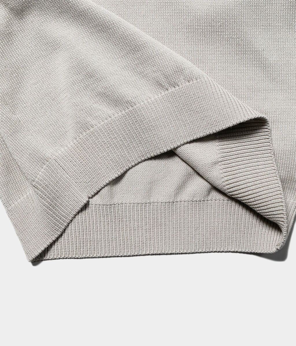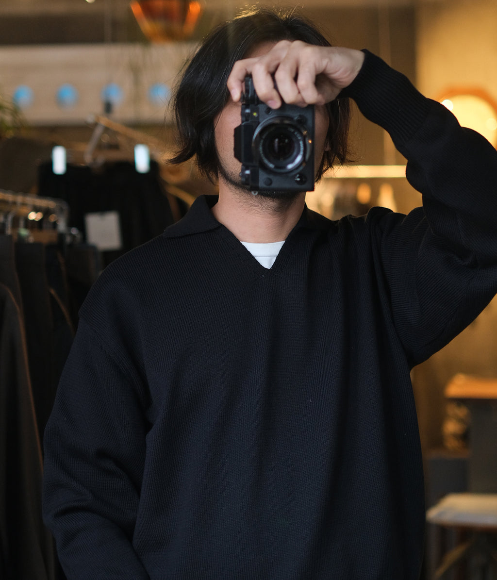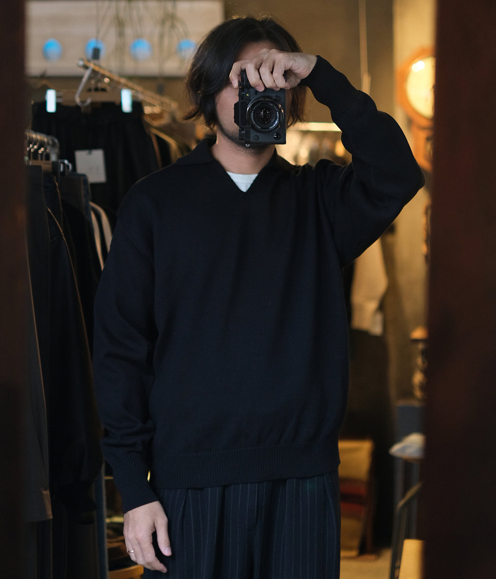 浅めのVネックが特徴的なデザイン。首元でインナーとのレイヤードを楽しめます。