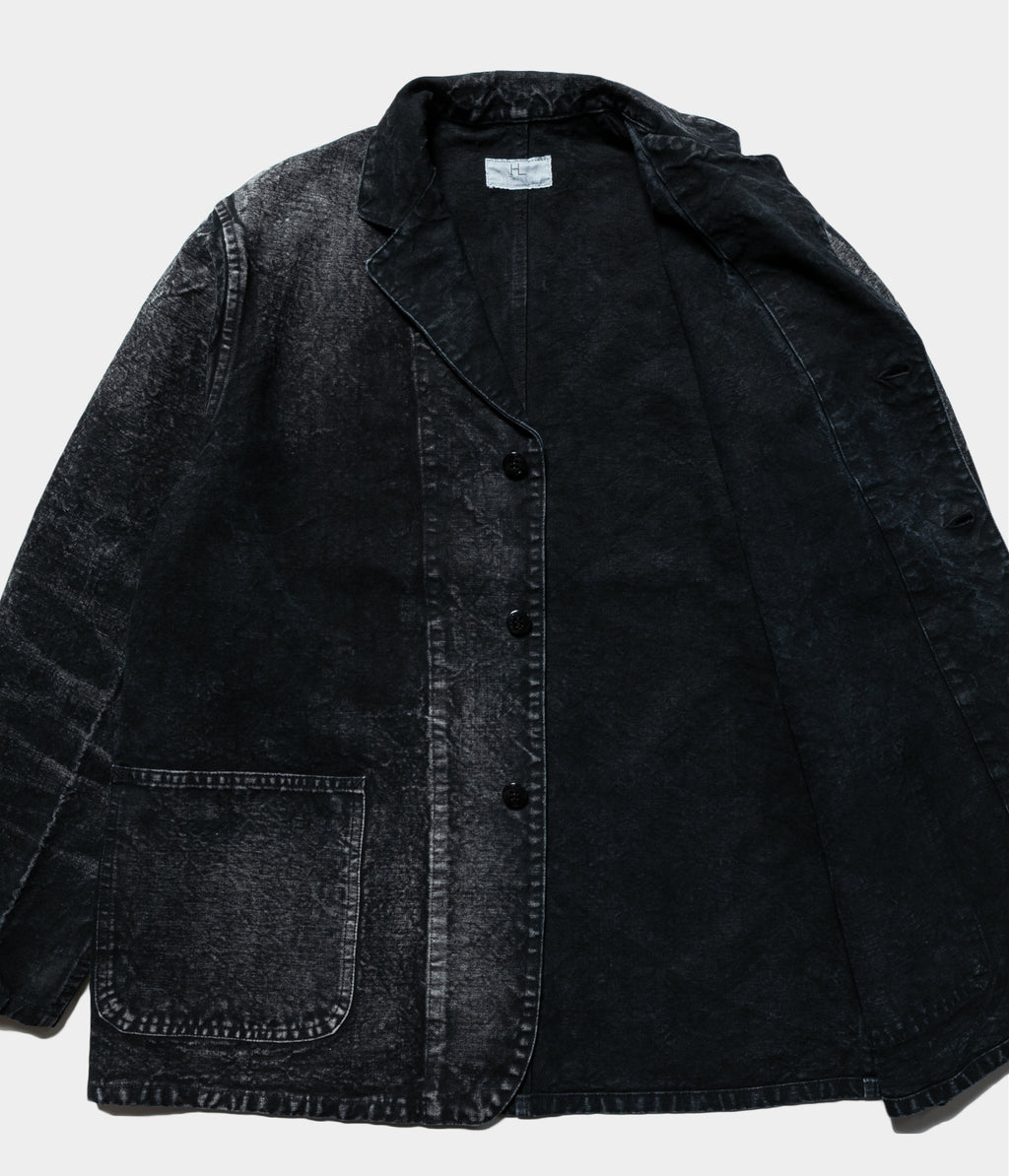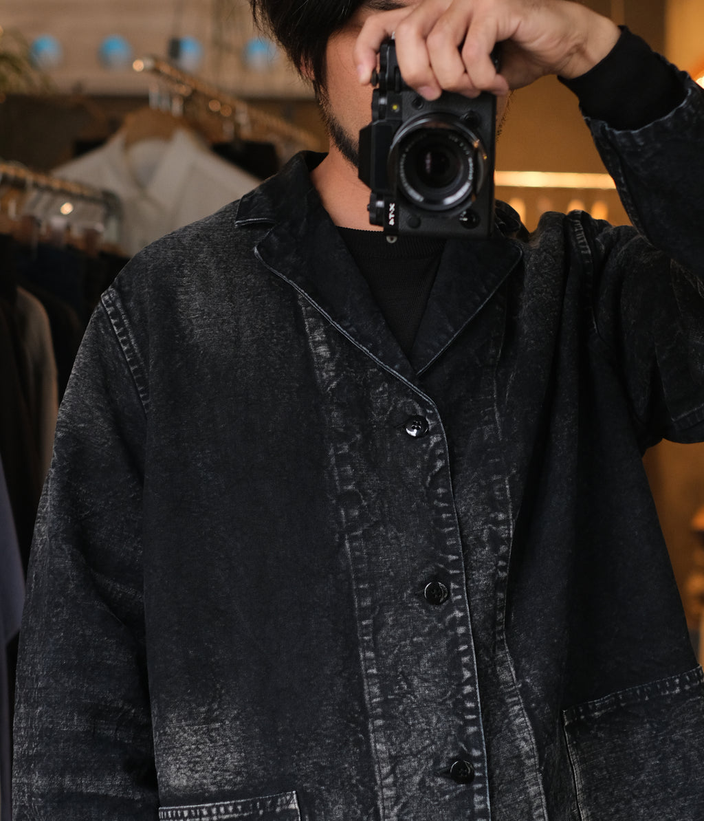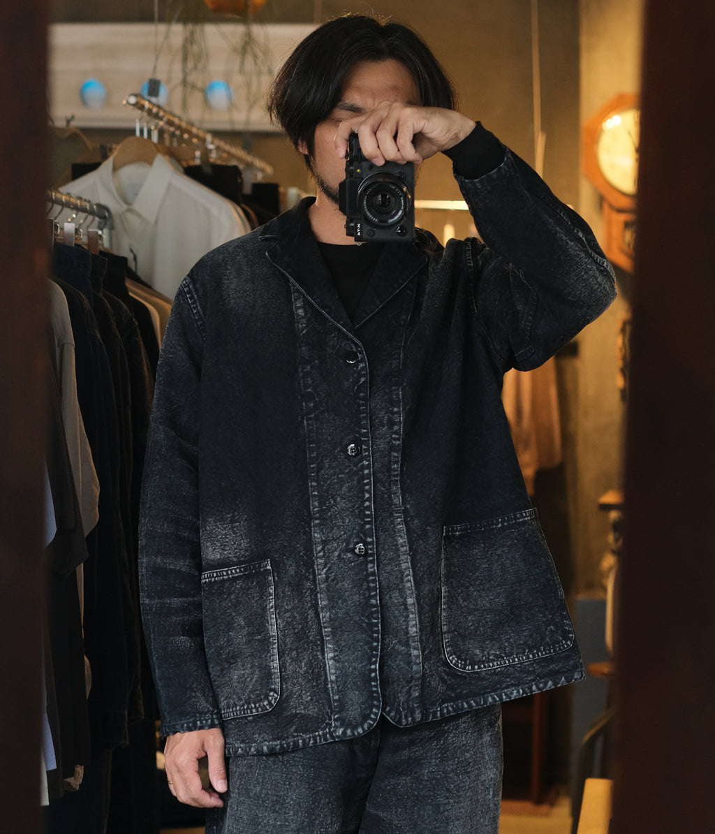 빈티지 워크 재킷을 모델로 했지만, 실루엣은 현대적으로 약간 여유롭다. 같은 소재의 팬츠와 세트업 스타일로 입는 것도 추천한다.