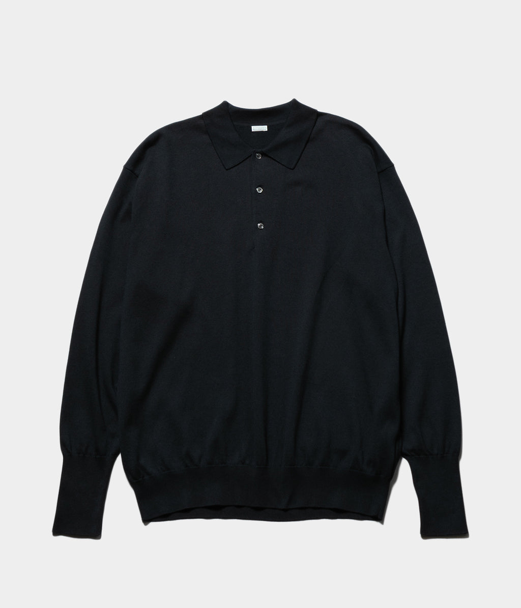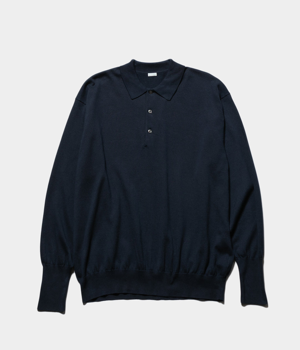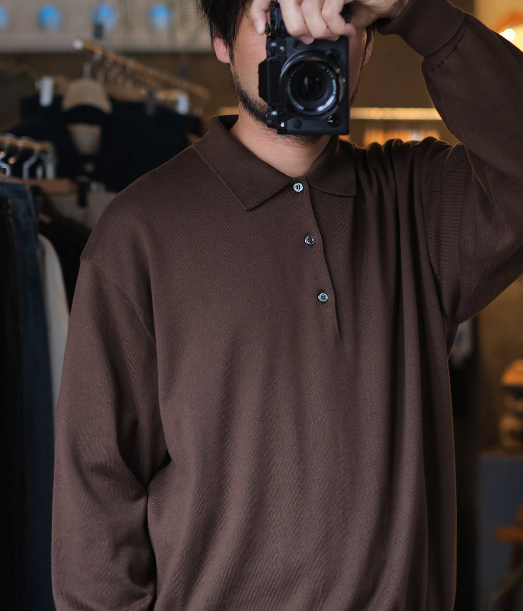 【デザイン】英国のクラシックハイゲージニットポロと、スポーツポロの良さを両立させたロングスリーブポロシャツ。全体的にゆったりとしているが、襟は程良く小ぶりなバランスに、袖口と裾のリブをきつく提灯の様 に編むことで綺麗なシルエットに設計。