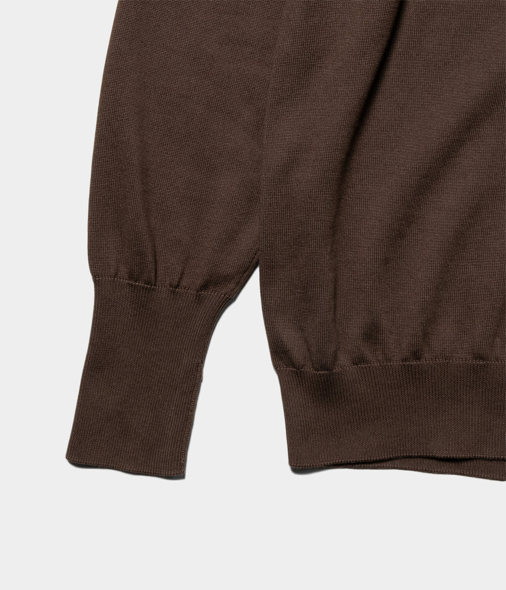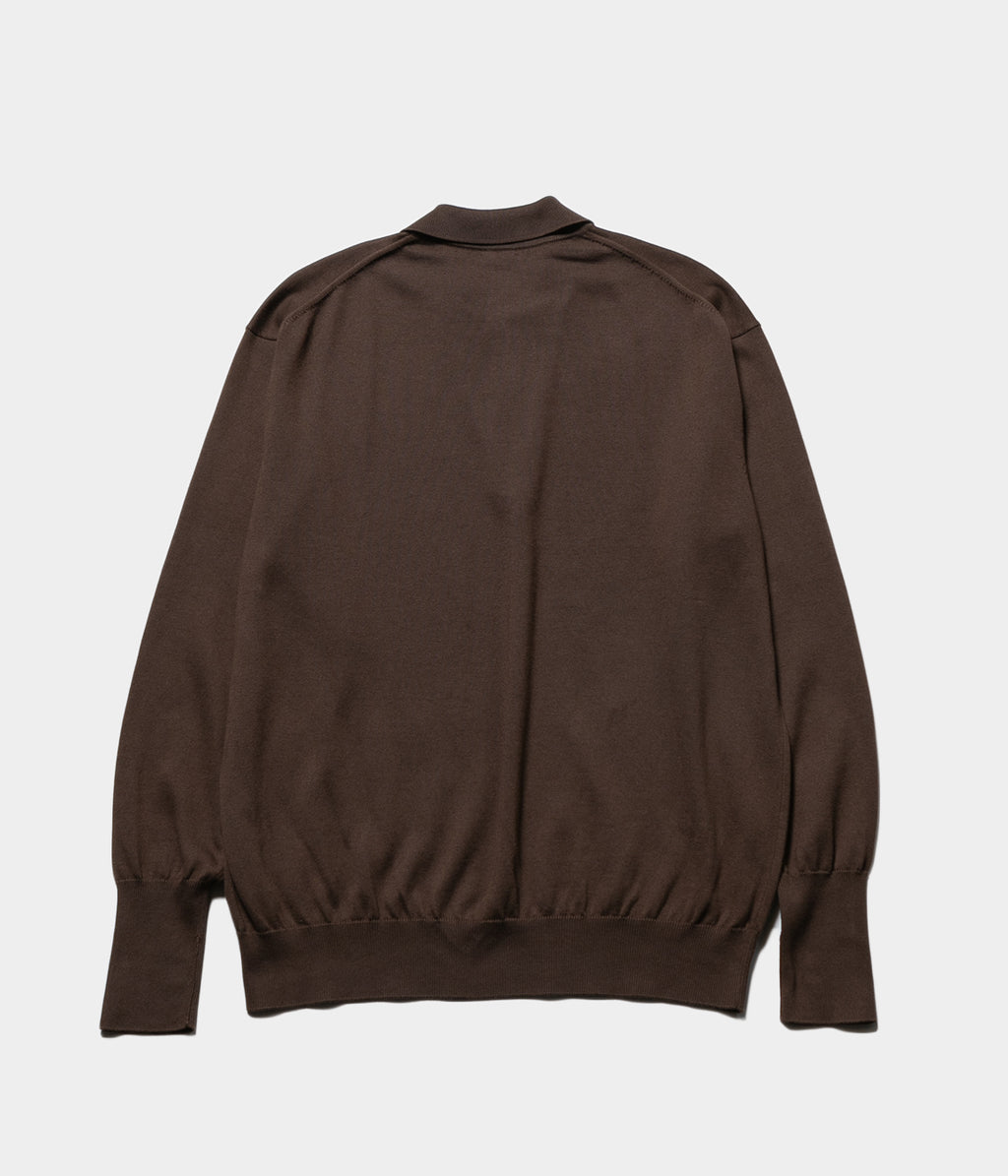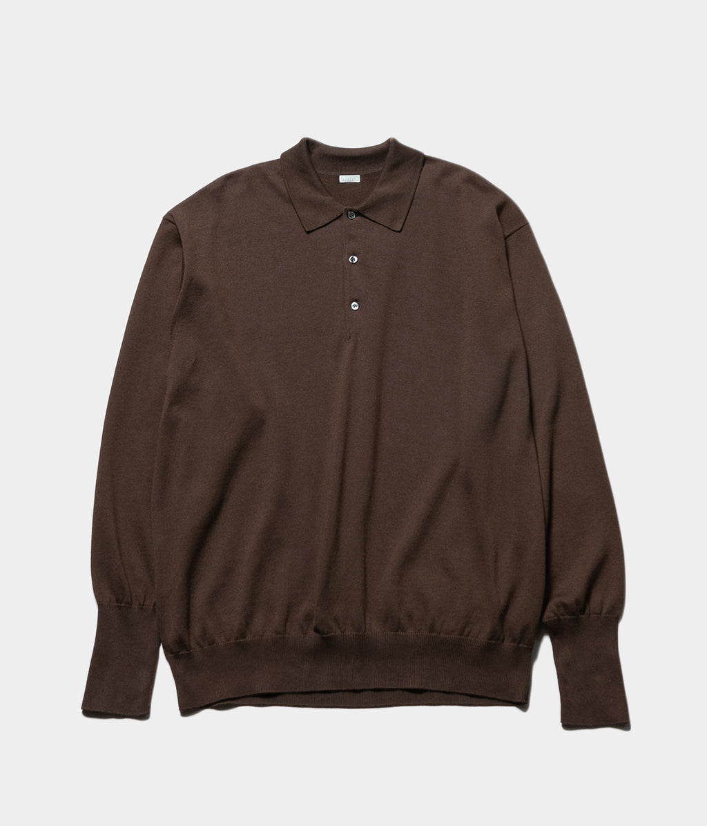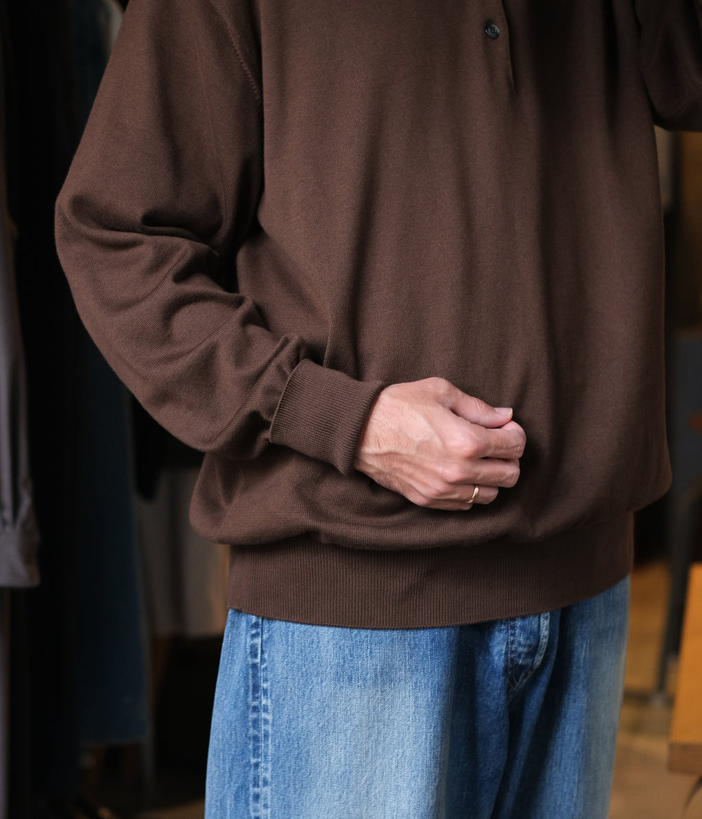 【デザイン】英国のクラシックハイゲージニットポロと、スポーツポロの良さを両立させたロングスリーブポロシャツ。全体的にゆったりとしているが、襟は程良く小ぶりなバランスに、袖口と裾のリブをきつく提灯の様 に編むことで綺麗なシルエットに設計。
