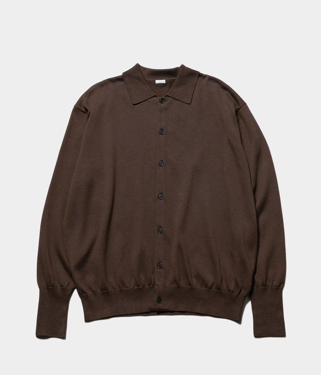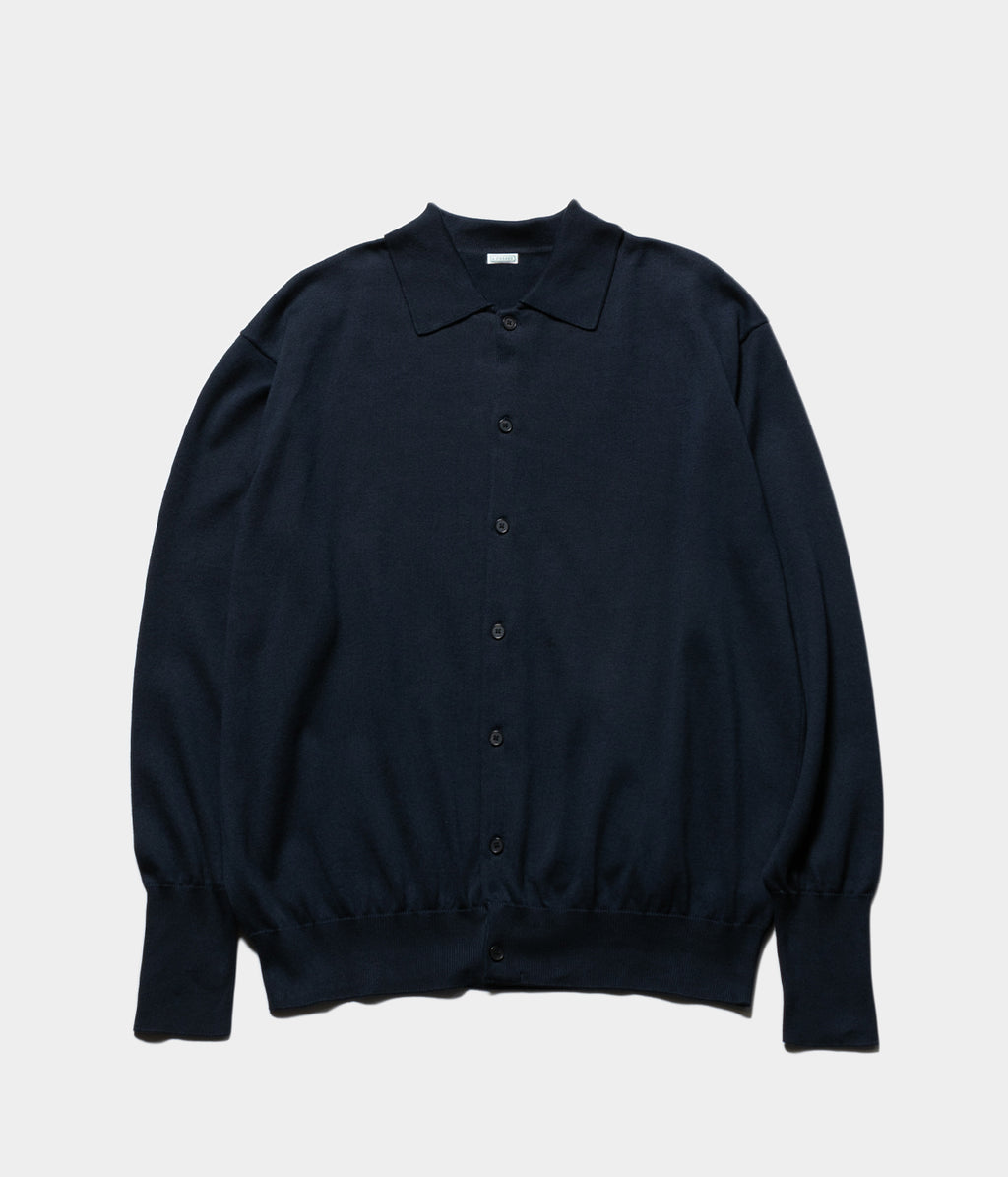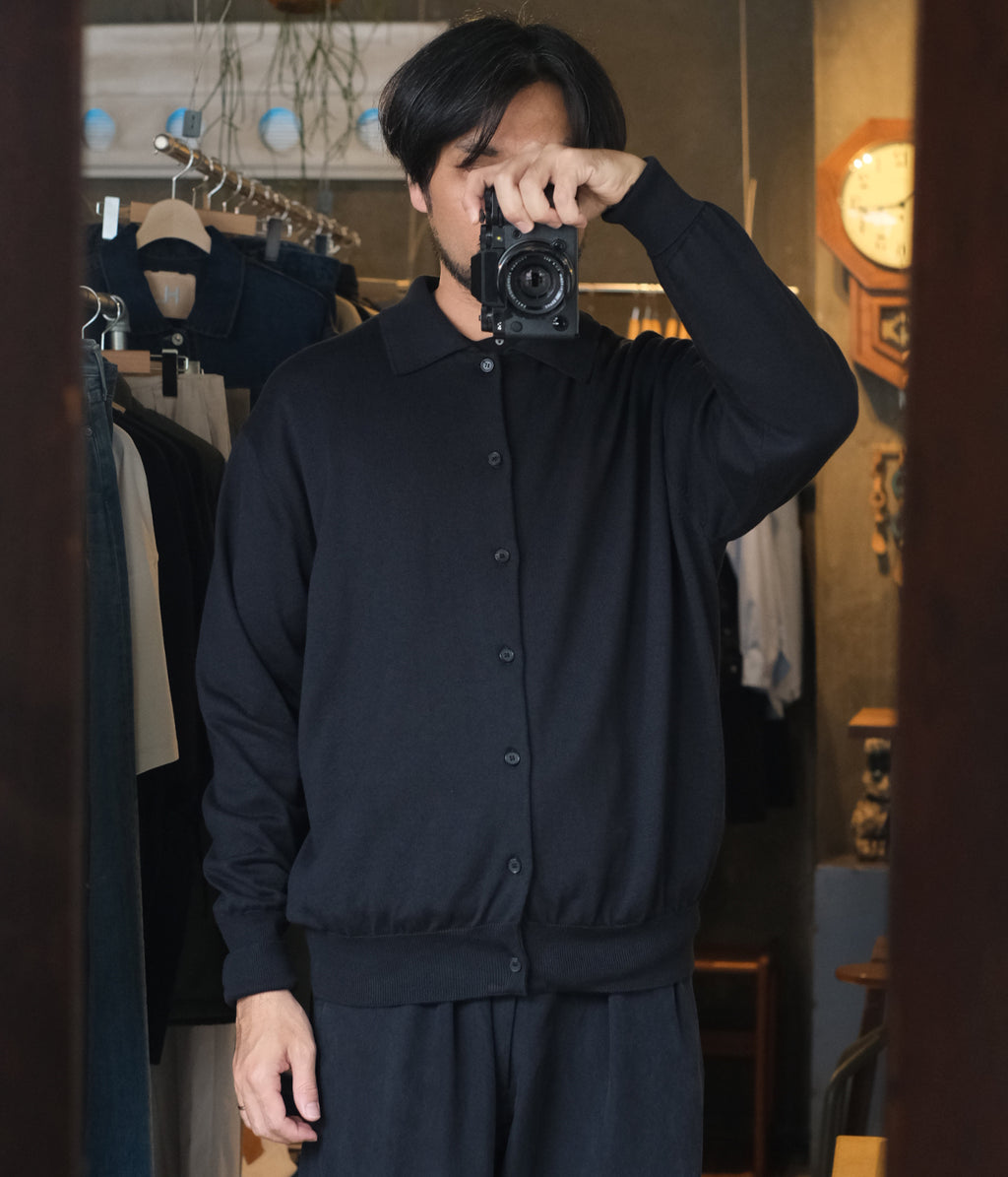 【デザイン】インナーとしてもアウターとしても使用できるポロ襟カーディガン台襟の無いイングリッシュカラーの1枚襟は、やや狭めのスプレッドカラー。全体的にゆったりとしているが、袖口と裾のリブをきつく提灯の様に編むことで綺麗なシルエットに設計。