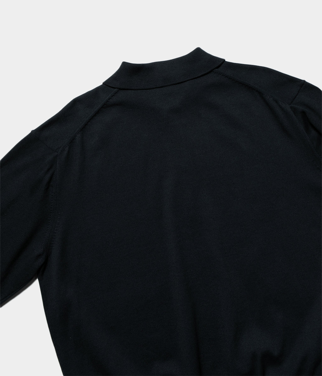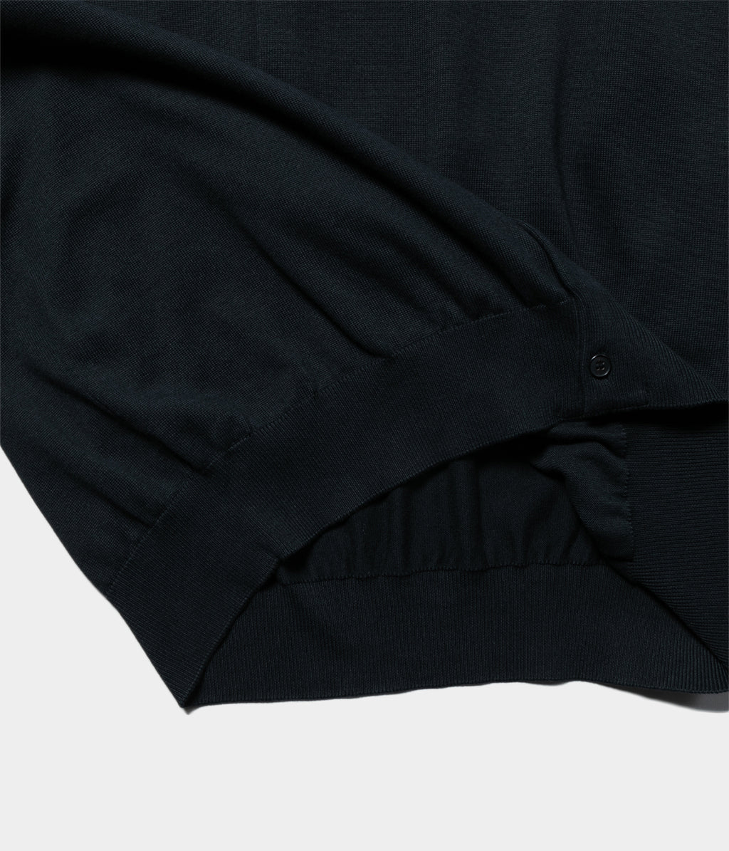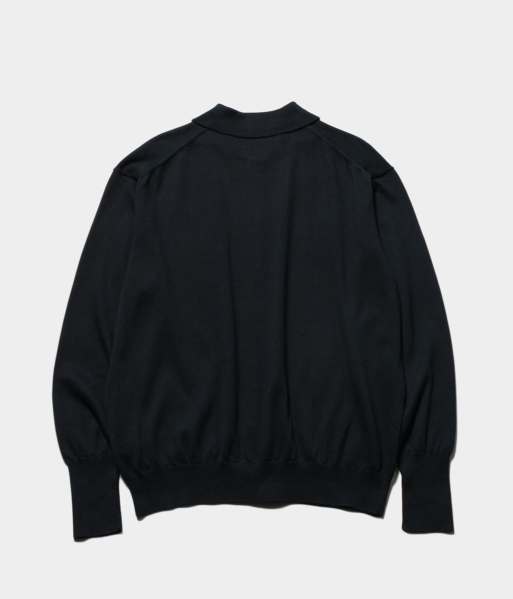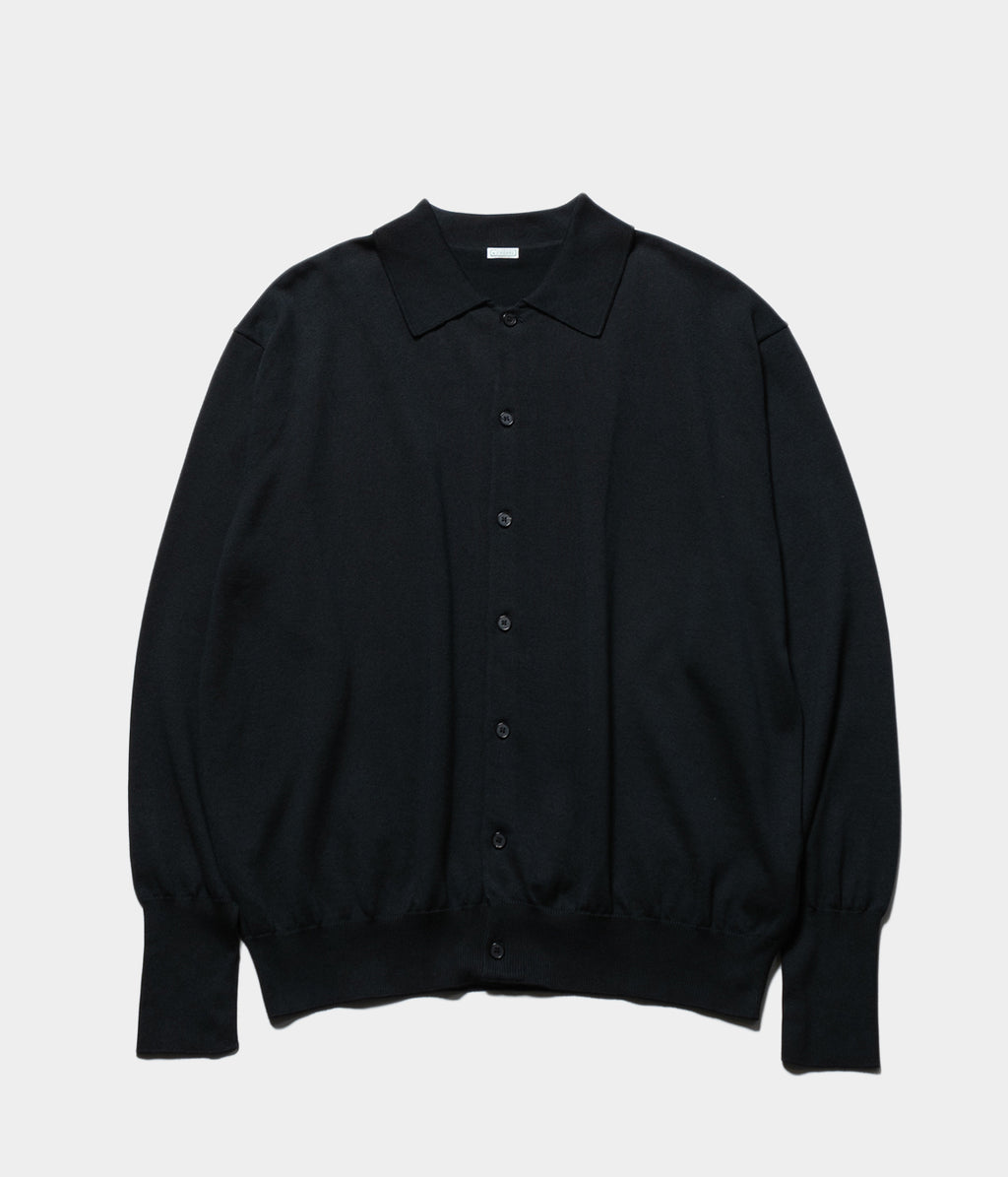 【デザイン】インナーとしてもアウターとしても使用できるポロ襟カーディガン台襟の無いイングリッシュカラーの1枚襟は、やや狭めのスプレッドカラー。全体的にゆったりとしているが、袖口と裾のリブをきつく提灯の様に編むことで綺麗なシルエットに設計。