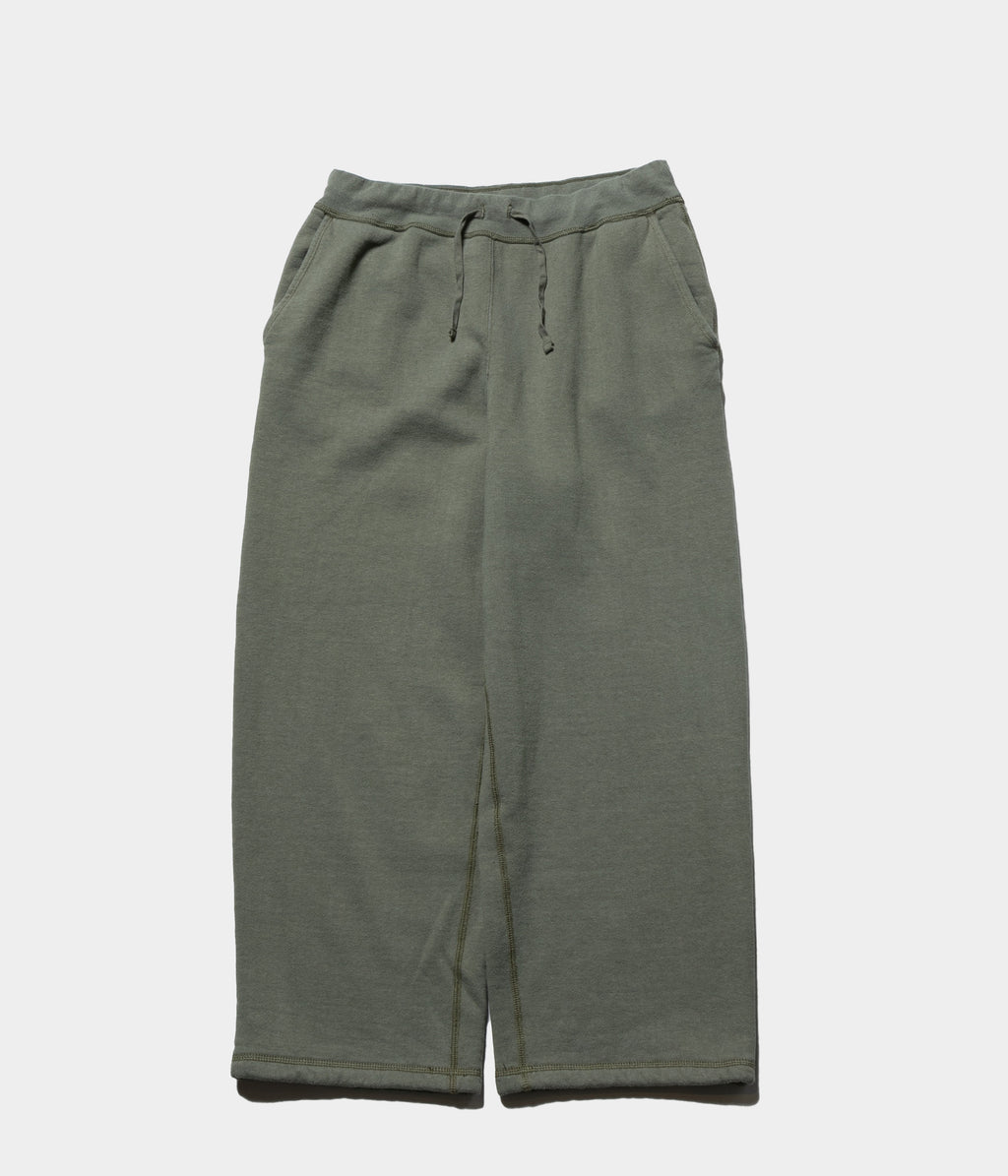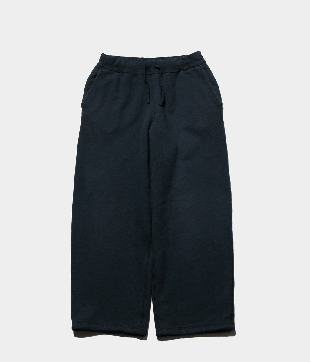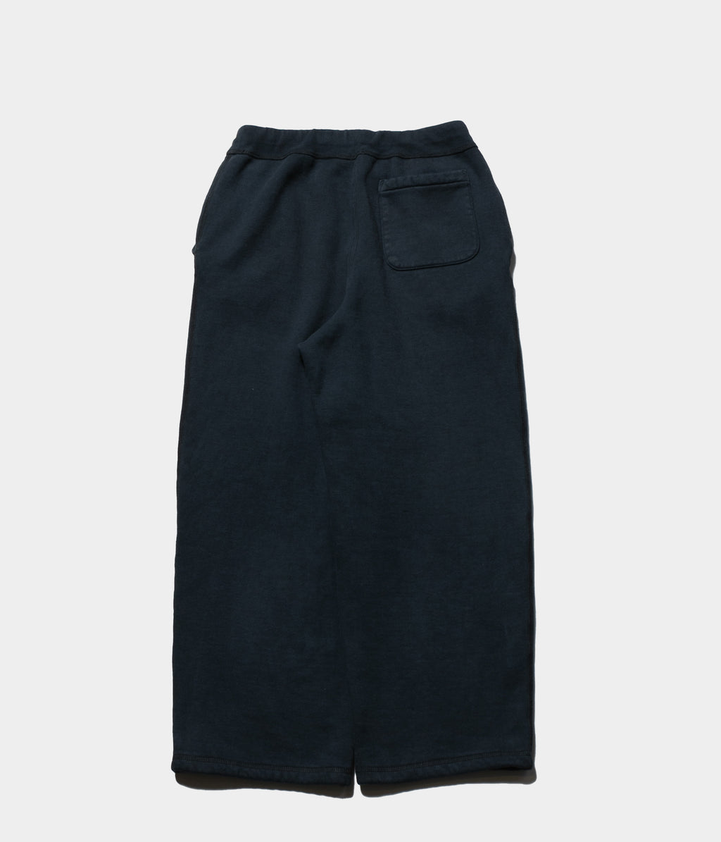 【デザイン】アメリカ製のスエットパンツをベースに、ゆったりとしたサイズ感にアップデートした。裾にスピンドルが付いているが、絞らずにジャストな丈で履ける様に設定。表に見えるステッチはミシンの設定を調整し、振りミシンでは見かけない太番手で縫製している。