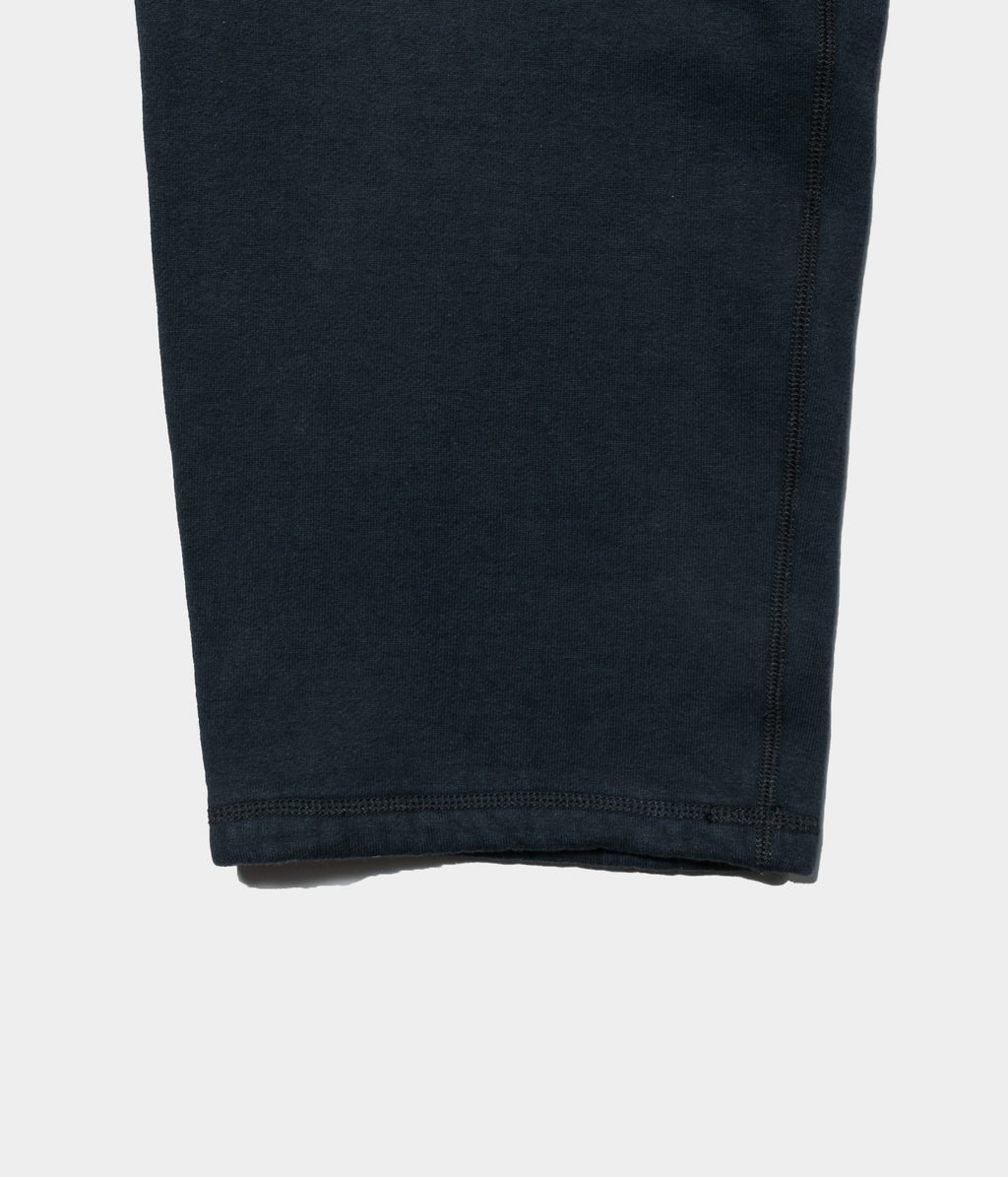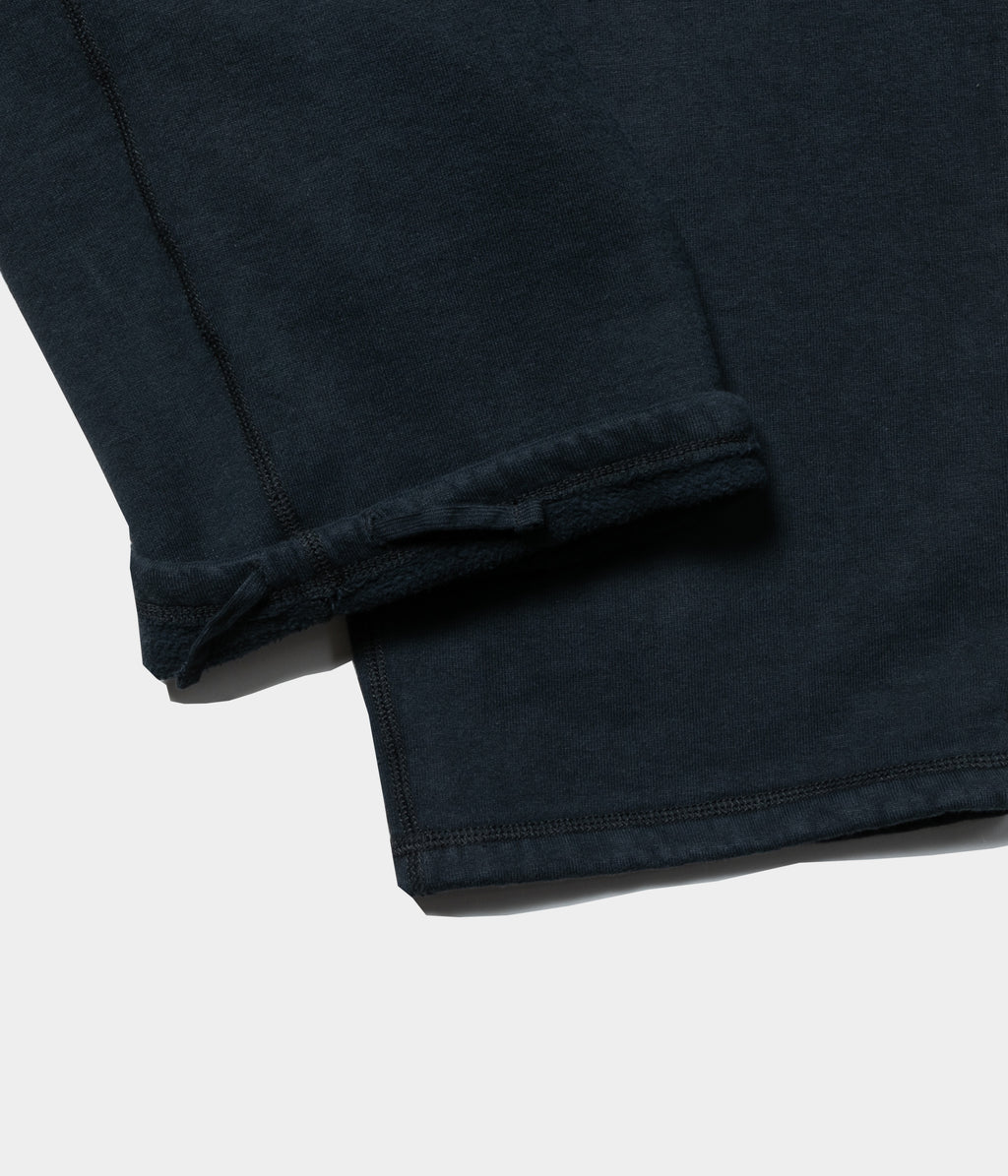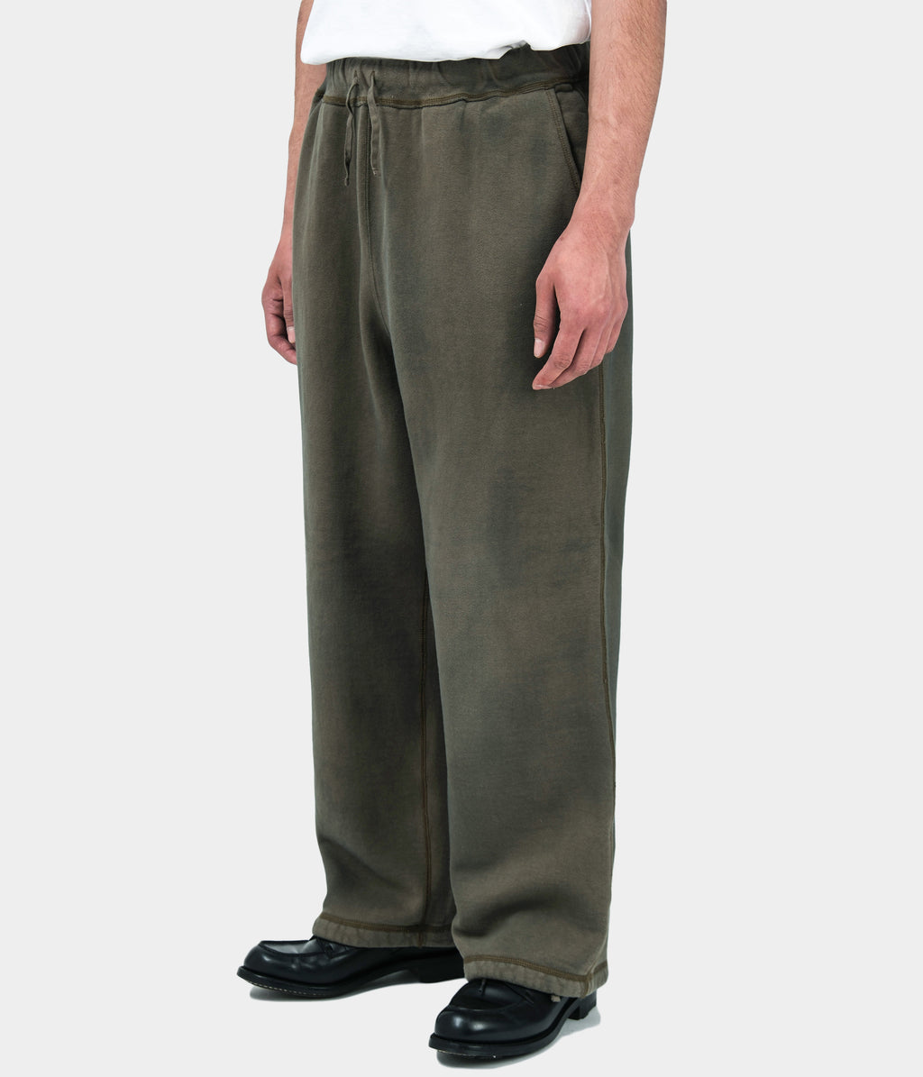 【デザイン】アメリカ製のスエットパンツをベースに、ゆったりとしたサイズ感にアップデートした。裾にスピンドルが付いているが、絞らずにジャストな丈で履ける様に設定。表に見えるステッチはミシンの設定を調整し、振りミシンでは見かけない太番手で縫製している。