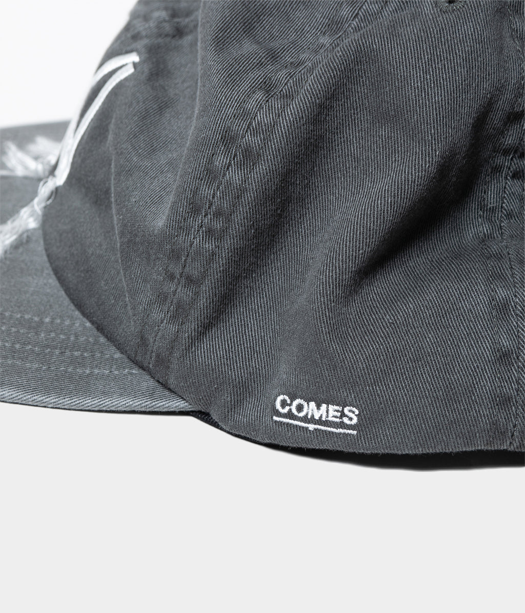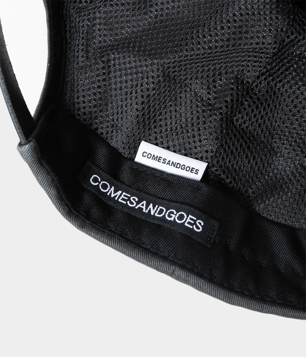”NY”ロゴから糸が垂れたデザインになっています。サイドには”COMES”の刺繍が入ります。裏地はクールマックスのメッシュを使用しています。後ろアジャスター部分は黒の牛革ベルト、バックルと小判ハトメはシックブラックのものを使用しています。