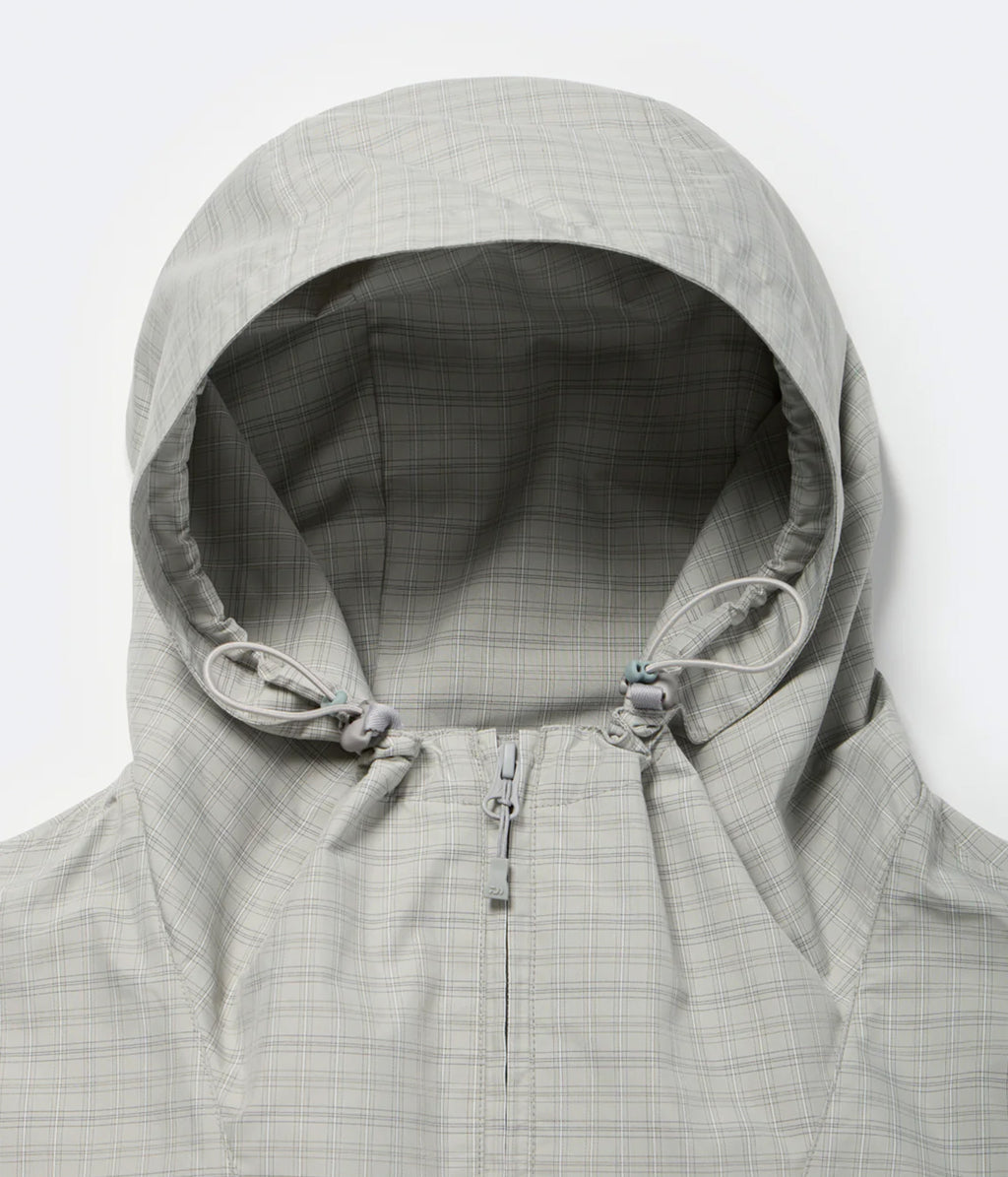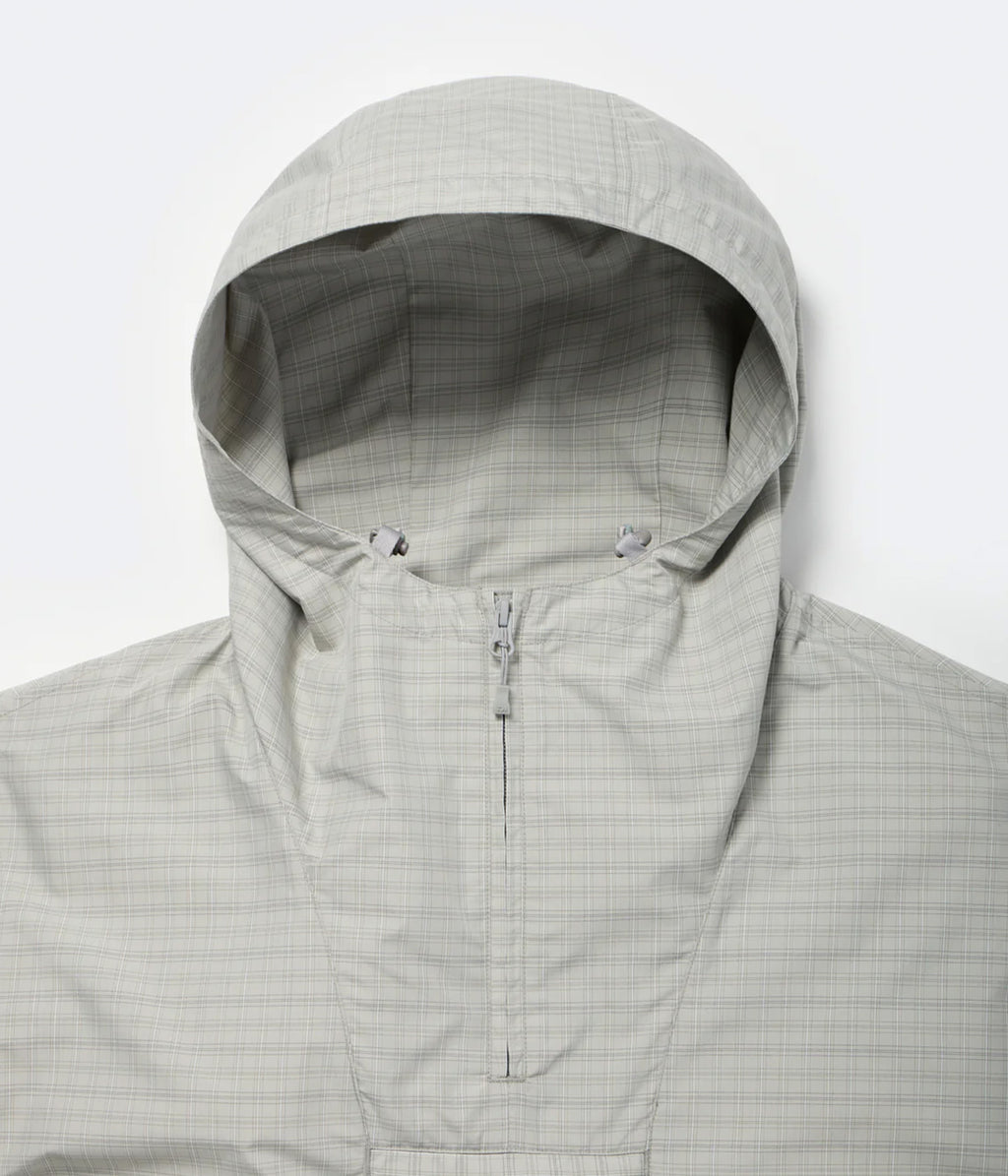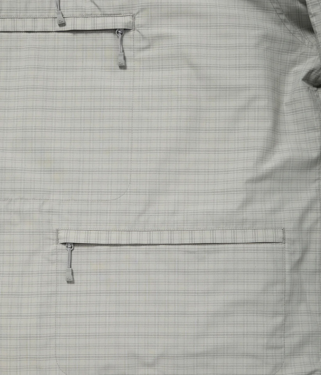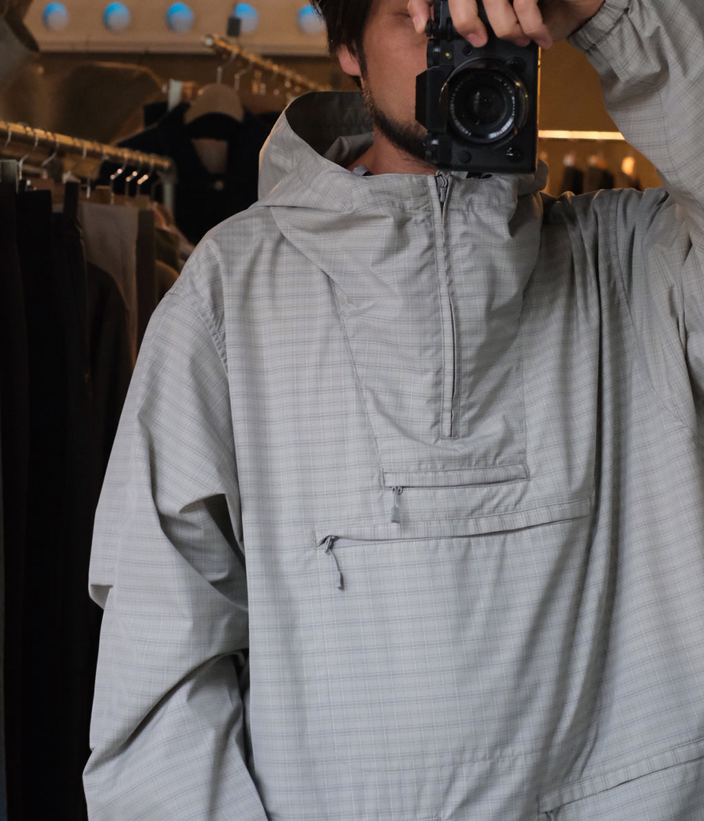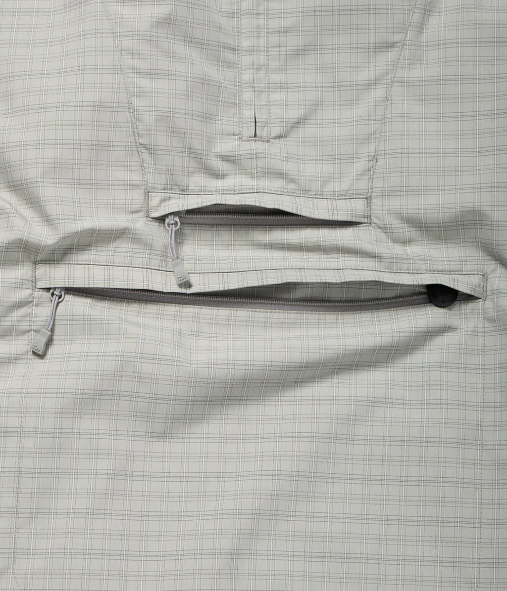 清涼感のあるオリジナル柄のチェックのシャツ地を使用して作成したコレクション。1990年代を代表するベーシックなアノラックパーカを現代的に仕様変更し、ポケットワークを様々加えアップデートした意欲作。フード切り替え部にデザインした小ぶりなジップポケットは釣りの際、携帯電話を入れることで、手ぶらで撮影ができる仕様。その他、バックポケットも加え、収納力を高めている。ミリタリーのディテールでもある前振りの袖がデザインアクセント、アクションプリーツを加え、袖口も調整出来るようにデザイン。釣りの際の可動域を広げ、袖口のもたつきも解消したデザイン。フロントのカンガルーポケット内にはピンオンリールホルダーも付属。ポリエステル100%ながらコットンのようなタッチ感のチェック素材。軽量で快適な着心地を実現。