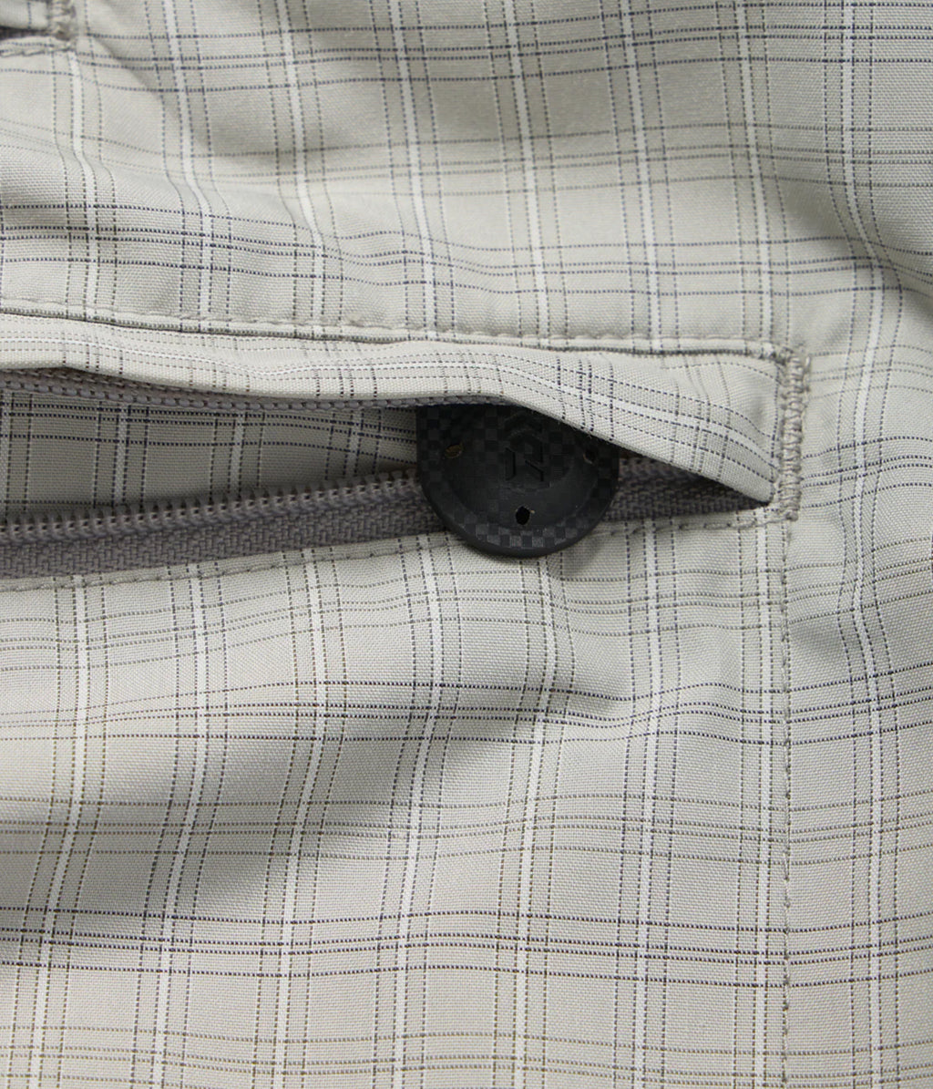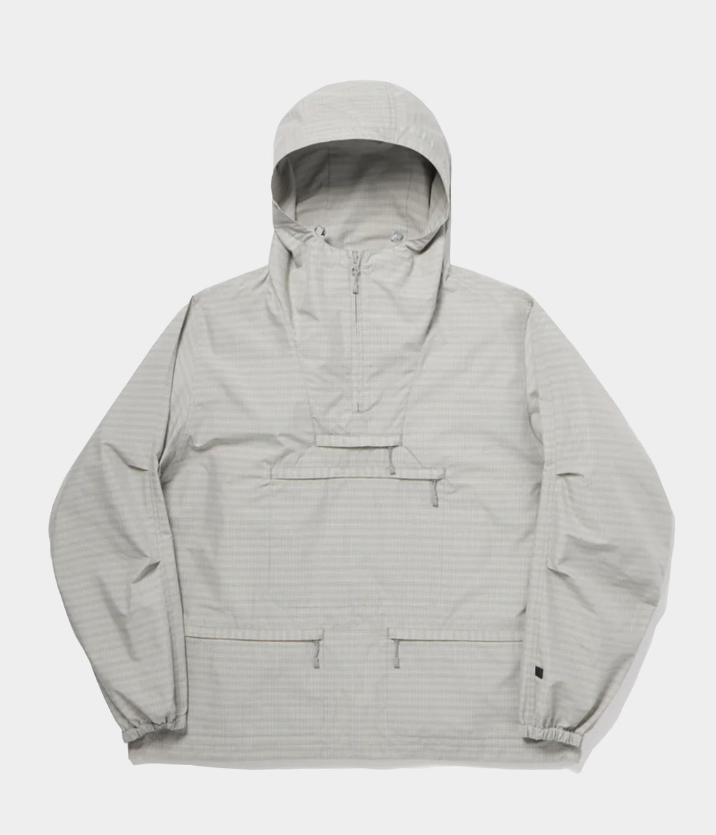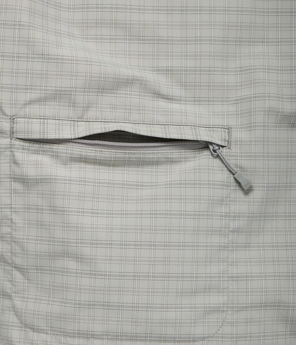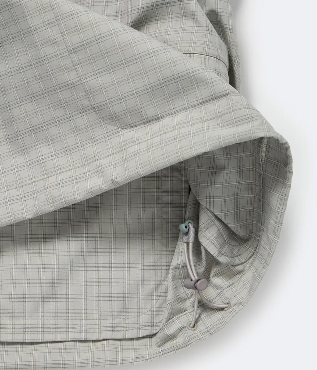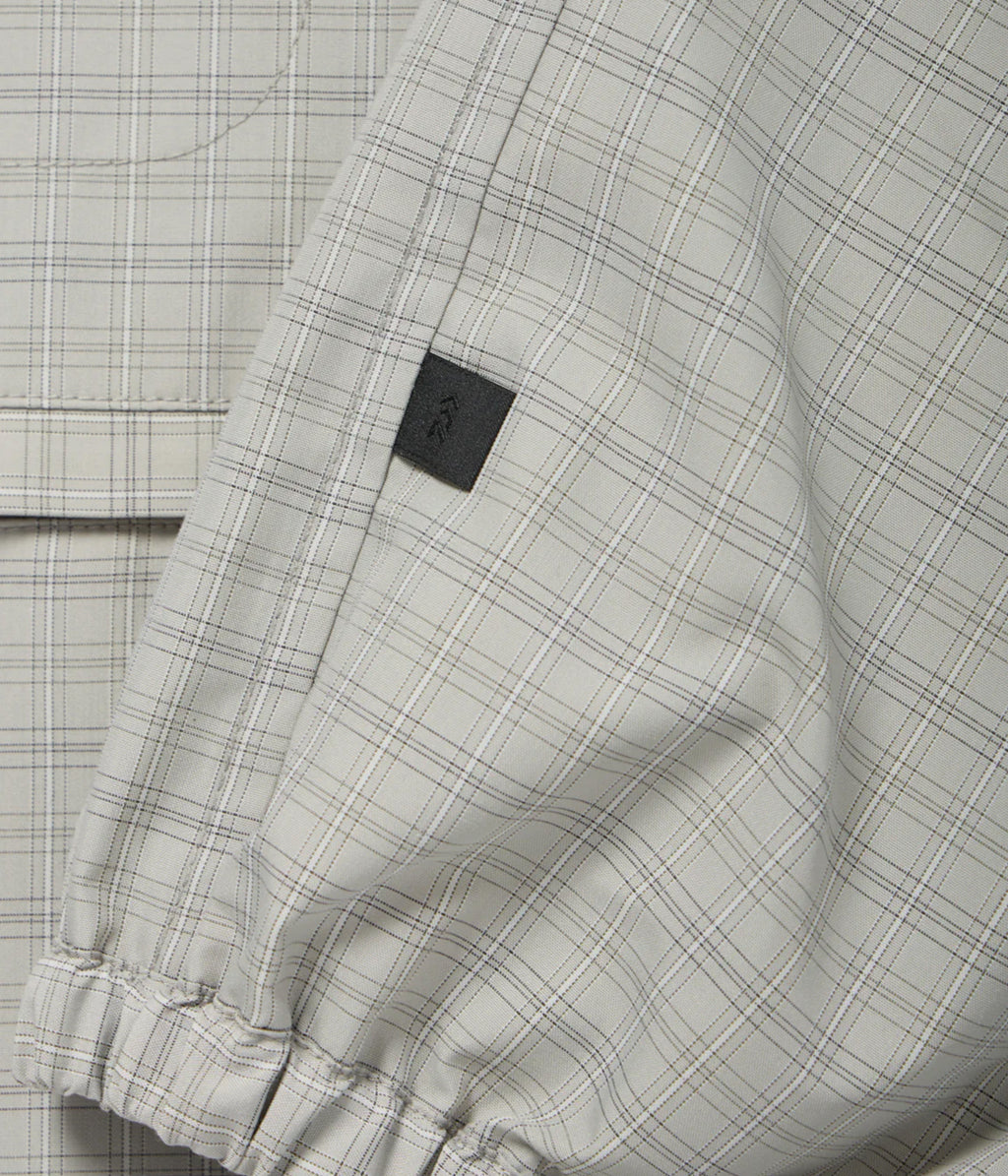 清涼感のあるオリジナル柄のチェックのシャツ地を使用して作成したコレクション。1990年代を代表するベーシックなアノラックパーカを現代的に仕様変更し、ポケットワークを様々加えアップデートした意欲作。フード切り替え部にデザインした小ぶりなジップポケットは釣りの際、携帯電話を入れることで、手ぶらで撮影ができる仕様。その他、バックポケットも加え、収納力を高めている。ミリタリーのディテールでもある前振りの袖がデザインアクセント、アクションプリーツを加え、袖口も調整出来るようにデザイン。釣りの際の可動域を広げ、袖口のもたつきも解消したデザイン。フロントのカンガルーポケット内にはピンオンリールホルダーも付属。ポリエステル100%ながらコットンのようなタッチ感のチェック素材。軽量で快適な着心地を実現。