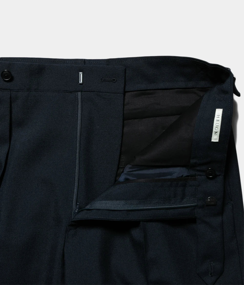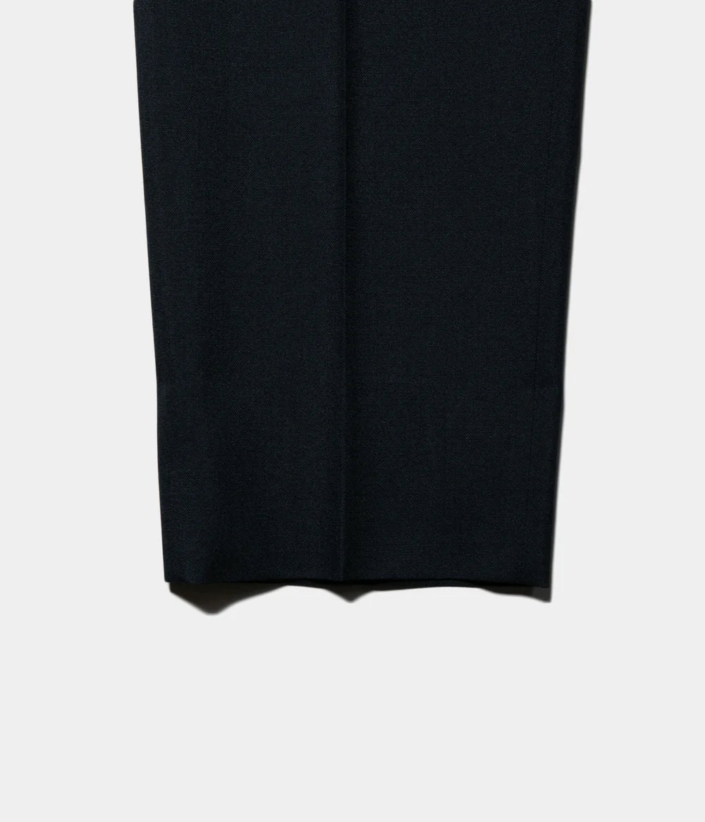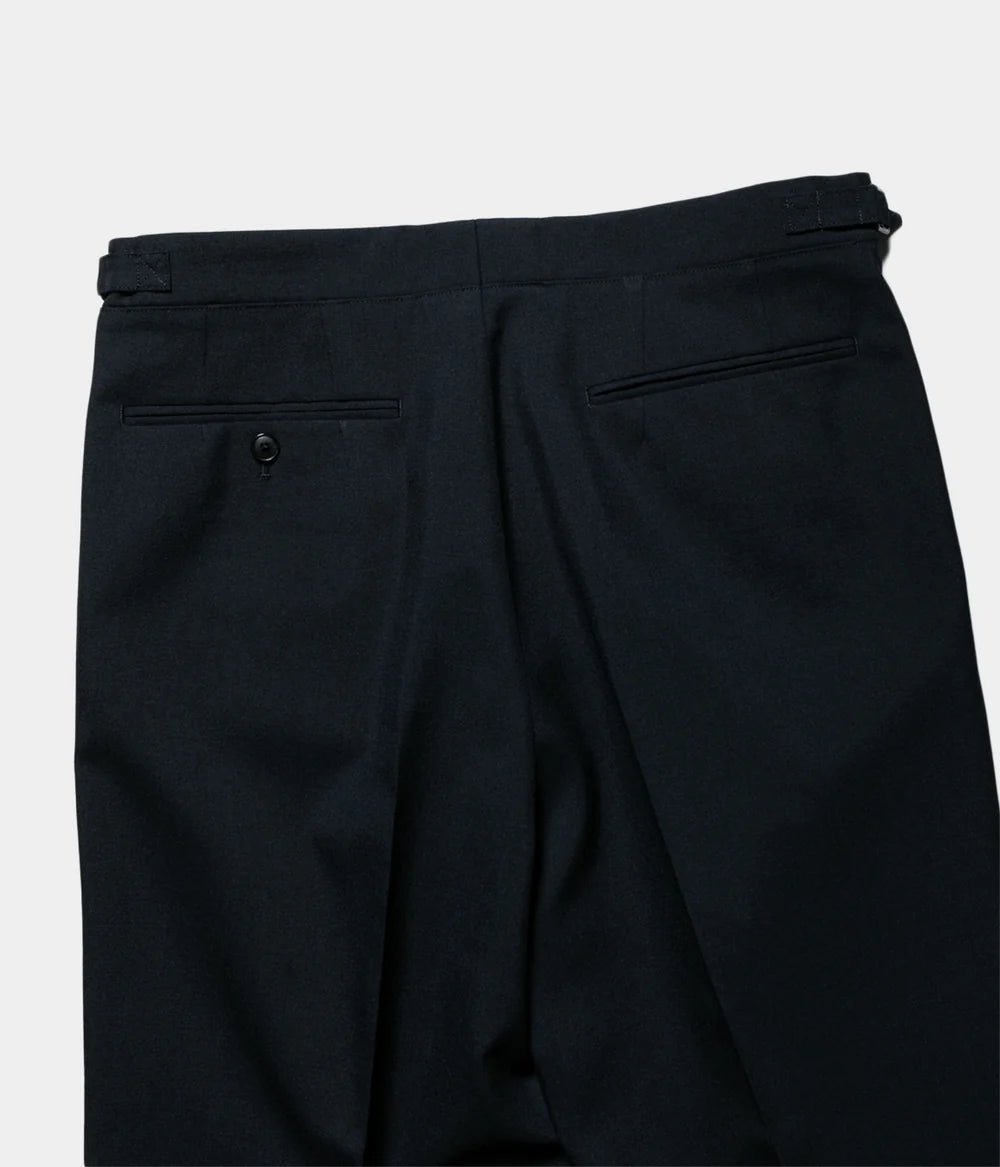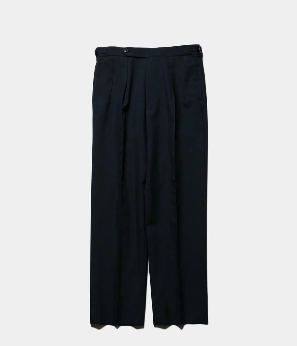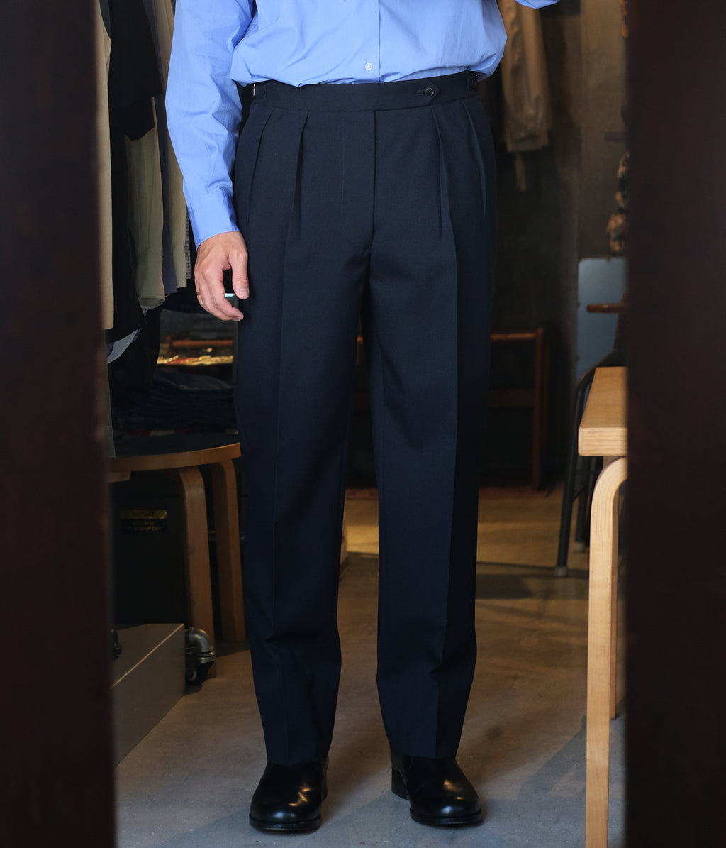 腰回りはベルトループを付けずにサイドアジャスターで調整する仕様となっており、タックインした佇まいはすっきりとしていて美しいです。